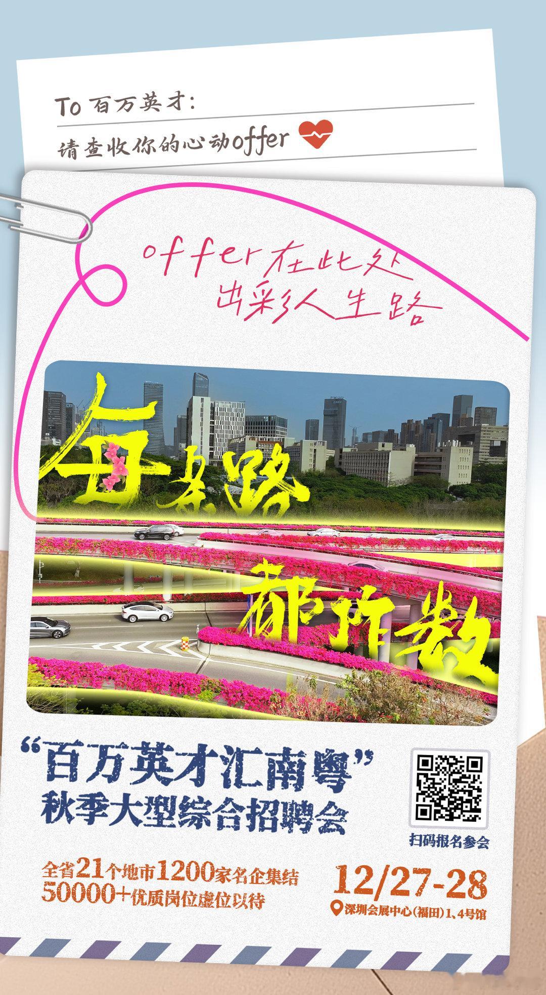 🔥🔥🔥南粤引才终极盛宴来袭!12.27-28深圳会展中心(福田),“百万英才汇南粤”秋季招聘会重磅启幕!✅ 1200+名企集结:世界500强、央企国企、三甲医院、顶尖科研机构齐上阵,华为、腾讯、比亚迪等大厂带队揽才✅ 5万+优质岗位:年薪50W+岗扎堆,先进制造、AI、低空经济、大健康等新兴赛道全覆盖,博士博士后专享高端机会✅ 创新求职体验:“未来大道”沉浸式逛展,机器人表演、城市文化展、政策宣讲一站式解锁,APEC专区对接国际资源✅ 暖心福利拉满:免费职业妆造、AI简历优化、1对1就业指导,毕业生提前抢位享15天深圳免费住宿!全省21地市联动,产业链全链条岗位“一站式”对接,还有2027届实习岗同步释放~ 不管是职场精英、高校毕业生还是留学人才,都能在这里找到发光舞台!📍地点:深圳会展中心(福田)⏰时间:12月27-28日👉 扫码报名锁定心动offer,赴一场与南粤的双向奔赴!百万英才汇南粤深圳招聘会粤港澳大湾区引才