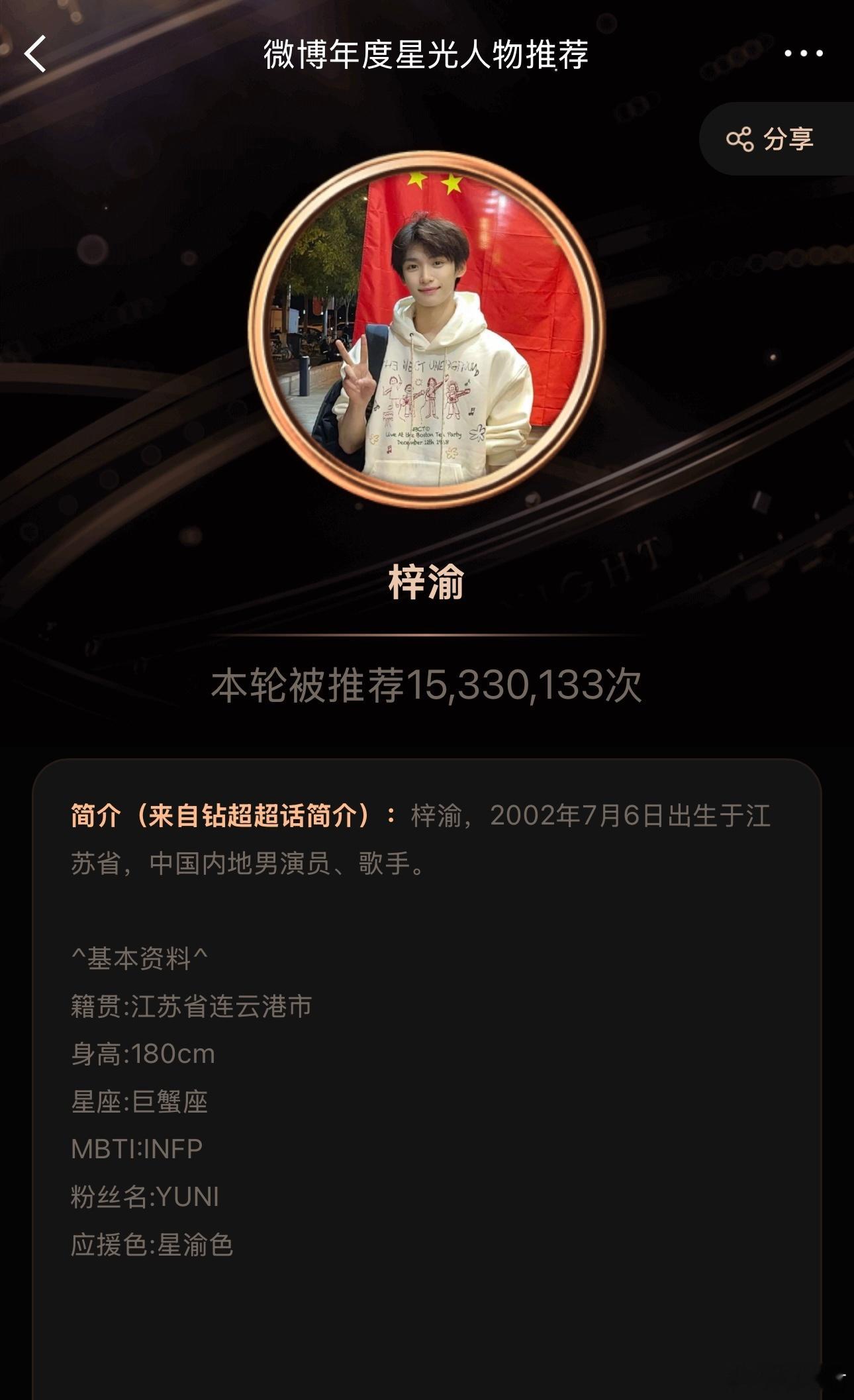 梓渝星光人物初选赛推荐值破万1000万,新顶梓渝太牛啦!恭喜梓渝,yuni们好棒