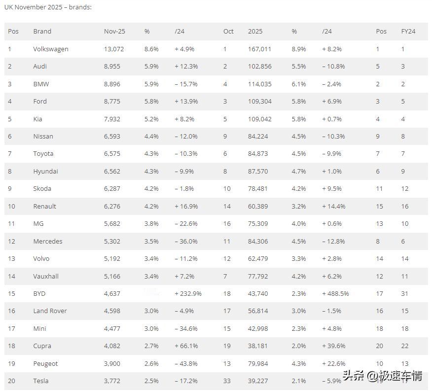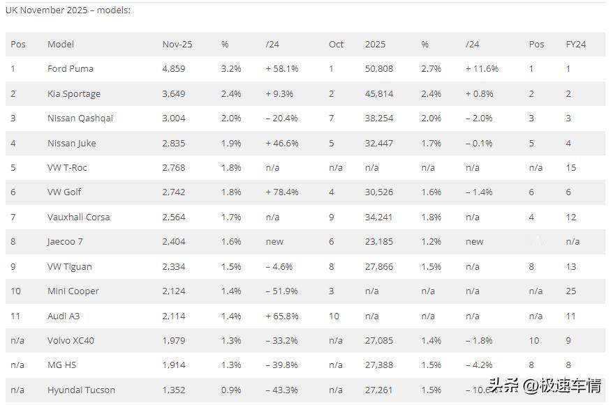 11月,英国车市,中国汽车销量详情! 大家好,这里是极速车情。今天为大家带来英国汽车市场11月的销量数据报告。 11月,英国车市同比下滑。电动化(BEV+PHEV)车型的持续增长,份额已高达38.3%;燃油车型销量持续下滑,印证了电动化大趋势不可逆。 中国品牌表现分化:比亚迪同比和环比都增长不少;名爵则同比下滑、Omoda同比暴增,但环比下滑;奇瑞本品牌上市后销量则节节攀升。 2025年11月,英国新车销量同比下滑1.6%,至151,154辆。 2025年1-11月,英国累计销量同比增长3.4%,至1,874,271辆。 中国品牌表现优异: 名爵:5682辆,第11名,市占率3.8%。 比亚迪:4637辆,市占率3.1%。 注:奇瑞集团总和销量6490辆,市占率4%。 Jaecoo:3397辆,创下2.2%的历史份额新高。 Omoda:1726辆,市占率1.1%。 奇瑞:1367辆,市占率0.9%。 零跑:593辆。 吉利:353辆。 小鹏:91辆。 欧拉:30辆。 长安:28辆。