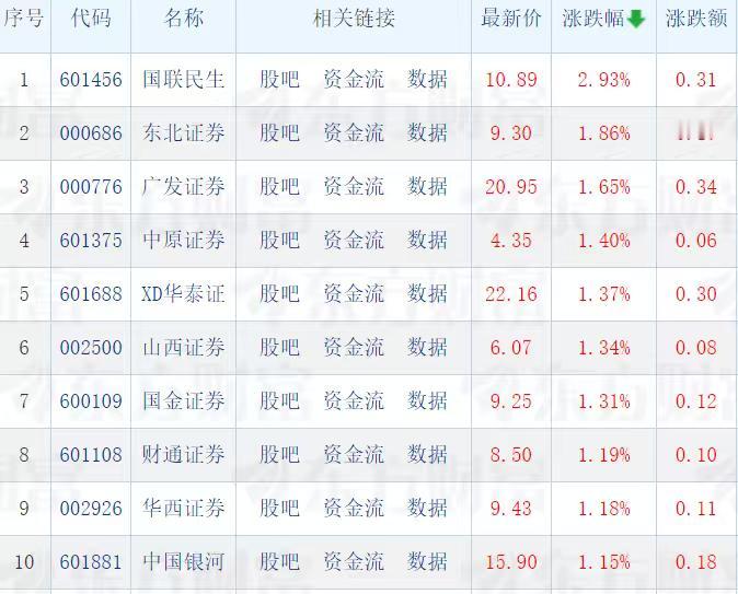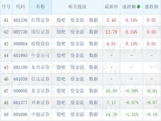 券商股今天当了一次逆转指数的神助攻。今天引领指数翻红的主力应该是保险股,但券商股应该是第一助攻手。 今天收盘46家券商股43家上涨,仅3家下跌。而且九家头部券商股悉数上涨。其中广发证券、华泰证券、中国银河涨幅进入券商股涨幅排行榜前十。 广发证券收盘上涨1.65%,居券商股涨幅排行榜第三名;华泰证券收盘上涨1.37%,居券商股涨幅排行榜第五;中国银河收盘上涨1.15%,居所有券商股涨幅排行榜第十名。 下跌的三家券商股分别是东方证券跌幅0.09%,兴业证券跌幅0.97%,中银证券跌幅1.31%。