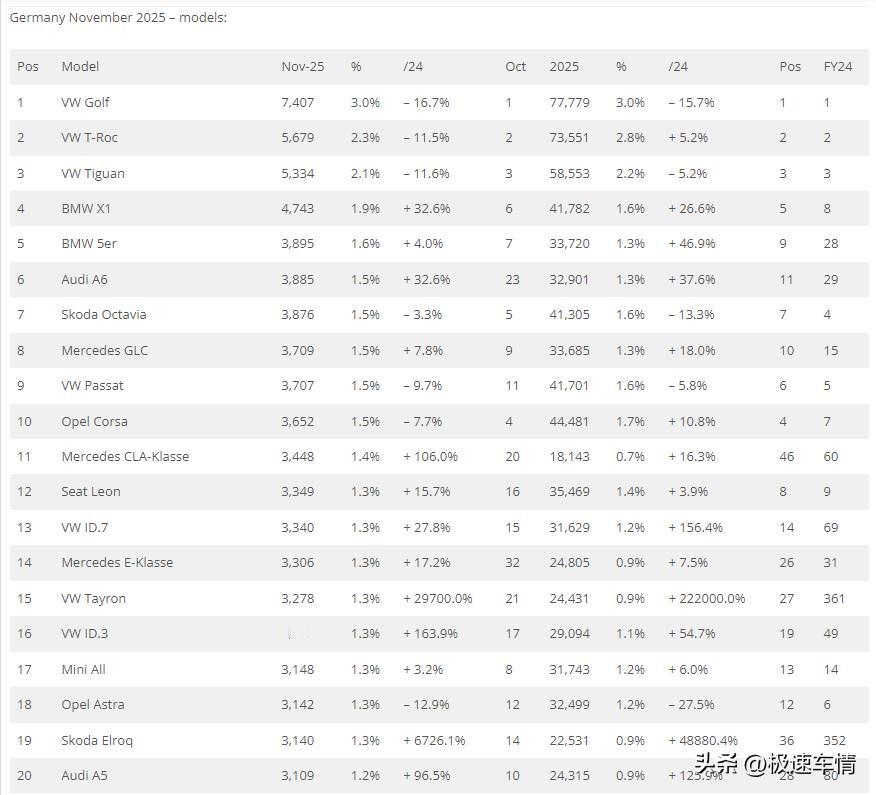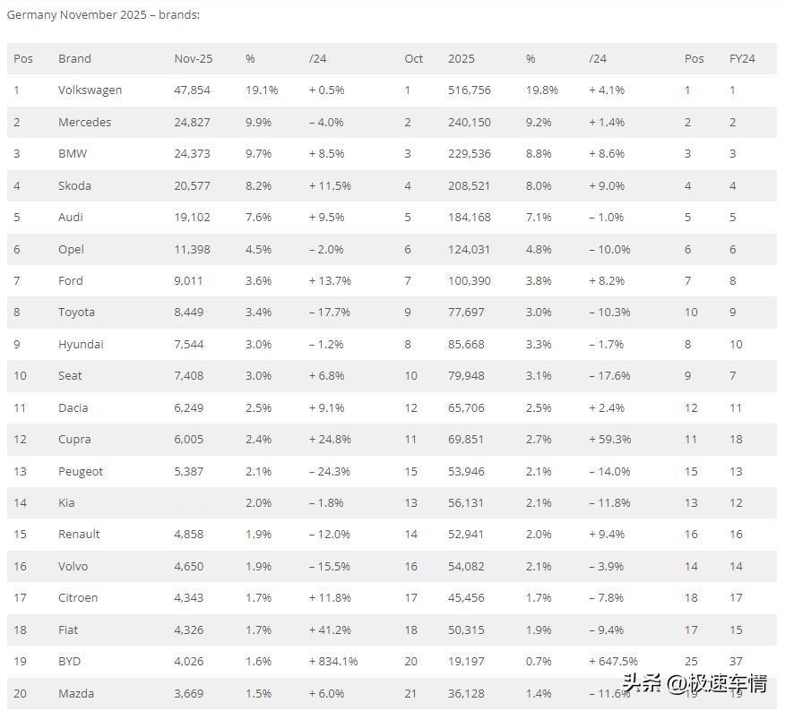 11月,德国车市,中国品牌销量详情! 大家好,这里是极速车情。今天为大家带来德国汽车市场11月份的销量数据报告。 11月,德国车市同比增长。纯电动车(BEV)销量同比激增58.5%至55,741辆,份额升至22.2%;电动化转型成效显著。大众霸主地位稳固,BBA表现强势。比亚迪突破4000辆大关,再次刷新销量新高,名爵、零跑表现同样优异,中国品牌的渗透力继续加深。 2025年11月,德国新车销量同比增长2.5%,至250,671辆。 2025年1-11月,累计销量同比微增0.7%,至2,611,152辆。 中国品牌表现:比亚迪销量首次突破4000辆,中国品牌销量8085辆。 比亚迪:4026辆,市占率1.6%。 名爵:2578辆,市占率1%。 零跑:1046辆,市占率0.4%。 小鹏:351辆。 长城:42辆。 领克:29辆。 蔚来:9辆。 Omoda:2辆。 Maxus:1辆。 深蓝:1辆。