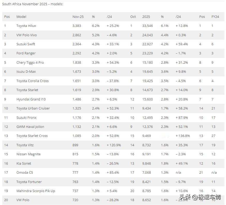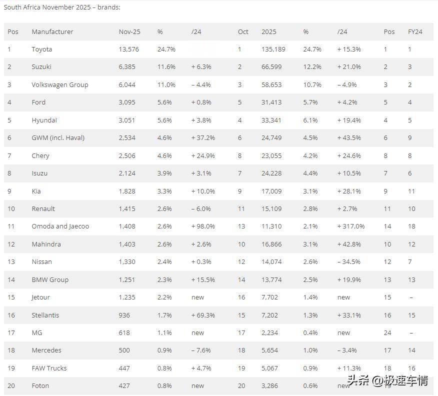 11月,南非车市,中国品牌销量详情! 大家好,这里是极速车情。今天为大家带来南非汽车市场11月份的销量数据报告。 11月,南非车市延续强劲增长态势。丰田凭借全品类优势领跑,奇瑞、Omoda&Jaecoo、捷途创纪录,奇瑞集团市占率高达9.5%,中国汽车的竞争力还在持续提升。 2025年11月,南非新车销量同比增长12.5%至54896辆,连续9个月双位数同比增长、连续14个月同比增长。 2025年1-11月,南非累计同比增长15.4%至547,966辆。 中国品牌表现出色:奇瑞集团市占率9.5%,长城市占率4.6%! 长城:2534辆,第六名,市占率4.6%。 注:奇瑞集团:5149辆,市占率9.5%,可排第四! 奇瑞:2506辆,第七名,市占率4.6%。 奇瑞Omoda&Jaecoo:1408辆,市占率2.6%。 捷途:1235辆,市占率2.2%。 名爵:618辆,市占率1.1%。 一汽卡车:447辆,市占率0.8%。 福田:427辆,市占率0.8%。 江淮:253辆,市占率0.5%。 北汽:124辆。 长安:97辆。