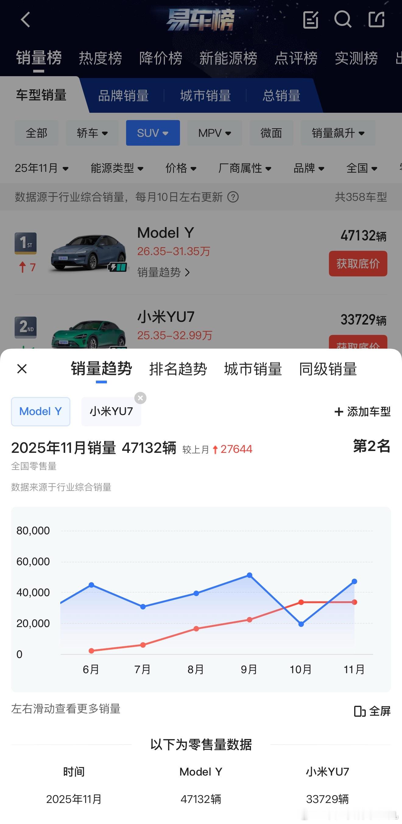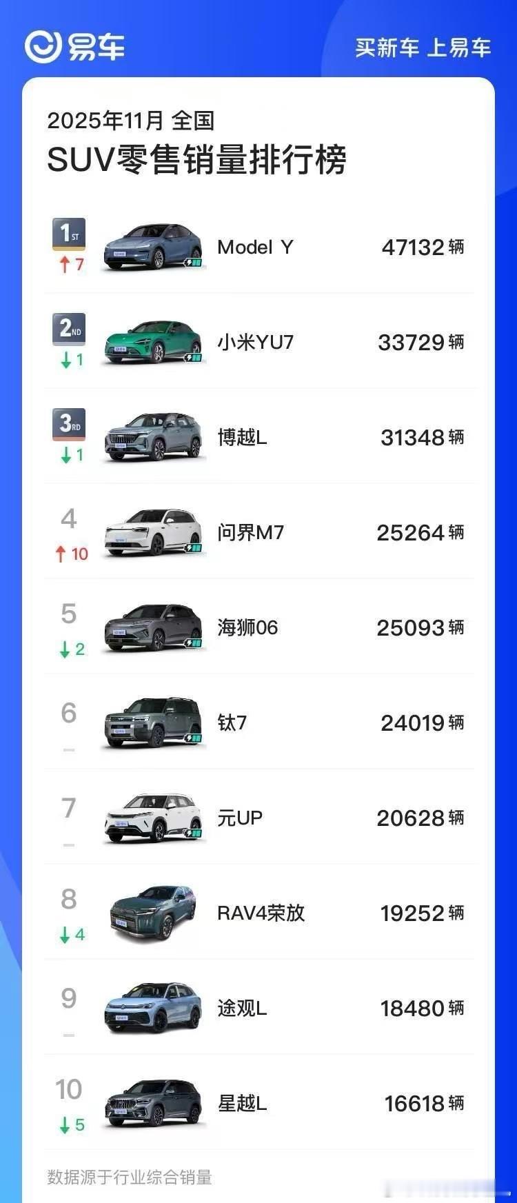 11月的SUV销量榜单!话说大家觉得明年小米YU7有没有可能连续在单月的销量超过Model Y? 其实今年10月份有过一次单月超越,但11月份又被追回来了!