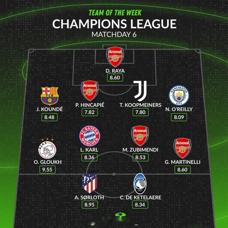 欧冠本轮最佳阵容:门将:拉亚(阿森纳)后卫:孔德(巴萨)、因卡皮耶(阿森纳)、库普梅纳斯(尤文)、奥赖利(曼城)中场:格洛赫(阿贾克斯)、卡尔(拜仁)、苏维门迪(阿森纳)、马丁内利(阿森纳)前锋:瑟尔洛特(马竞)、德凯特拉雷(亚特兰大)
