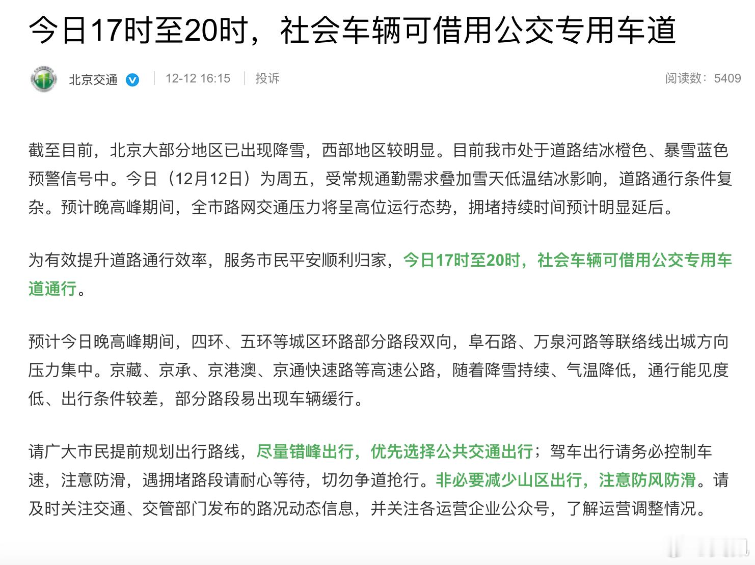 今晚可以走公交车道,希望大家平安归家🙏🏻社会车辆可借用公交专用车道通行北京雪后司机回家可走公交车道北京暴雪