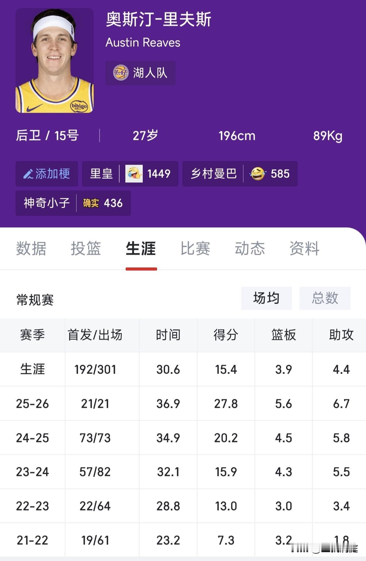 今天看到有球员吐槽詹姆斯我才知道里夫斯居然是落选球员,2021年湖人是怎么捡到宝的,本赛季进步最快球员可能就是他,在詹姆斯身边打球,第一个赛季居然只有7.3分,第二个赛季上涨到13分,他居然能跟詹姆斯五个赛季,从排不上号的“小弟”变成如今的二号“大腿”,里夫斯才是真正的传奇人物。
