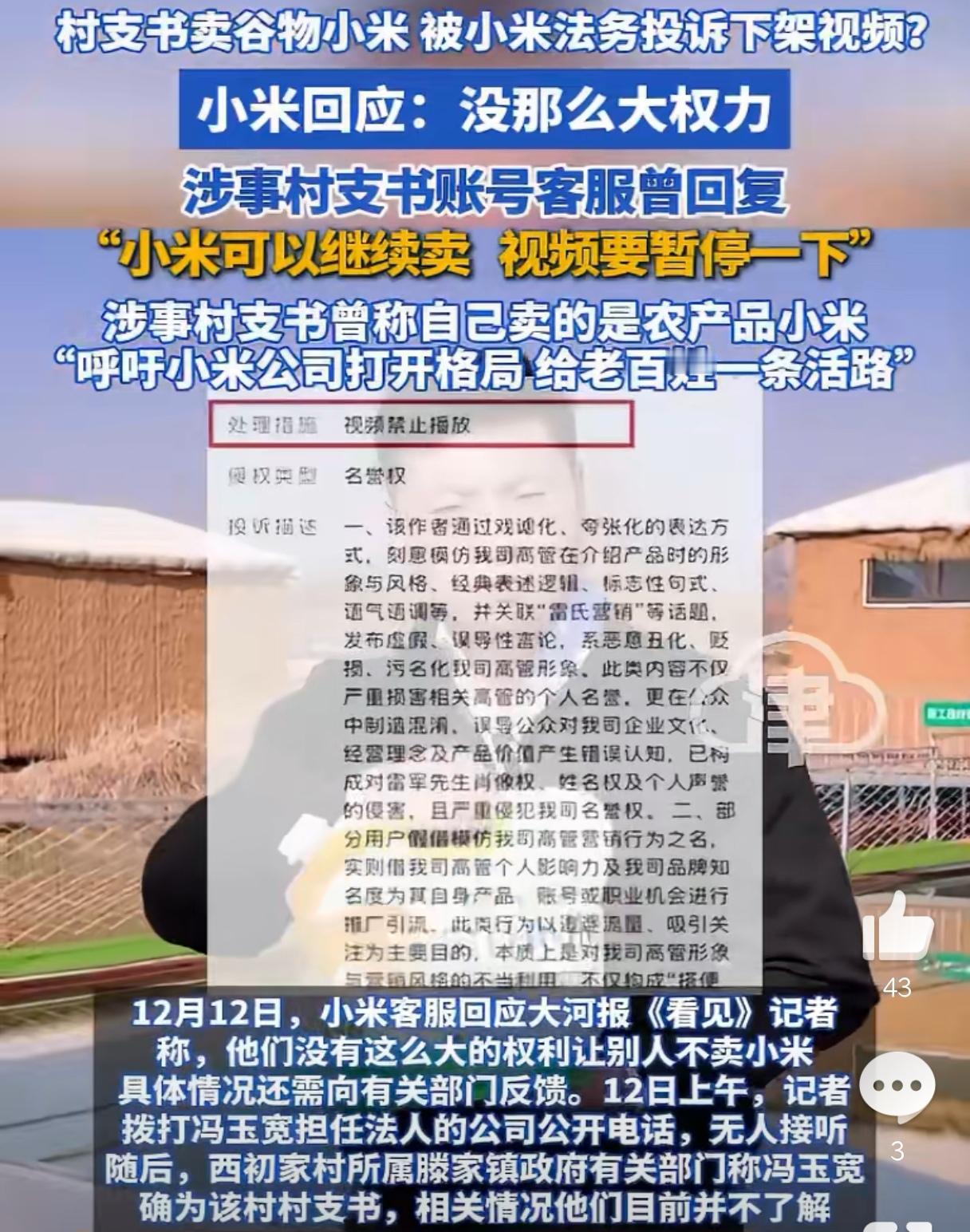村支书喊话小米这事,如今小米也回应了,说小米不是不让村支书卖小米,其实是让村支书卖小米的,只不过村支书恶意模仿,捏造污蔑,不仅涉嫌侵权,而且影响力小米的名誉,同时相关视频内容,完全失实,是彻头彻尾的歪曲与污蔑。所以小米才出手的。如今村支书删除视频,也发不了道歉视频,这事似乎告一段落了。不过个人觉得,这事就是双输,村支书自不必说,虽然赢得了一些人的支持,但他的做法太不可取了,至于小米,虽说有理有据,但因为这样的事再上热搜,确实还是对自己是有影响的!