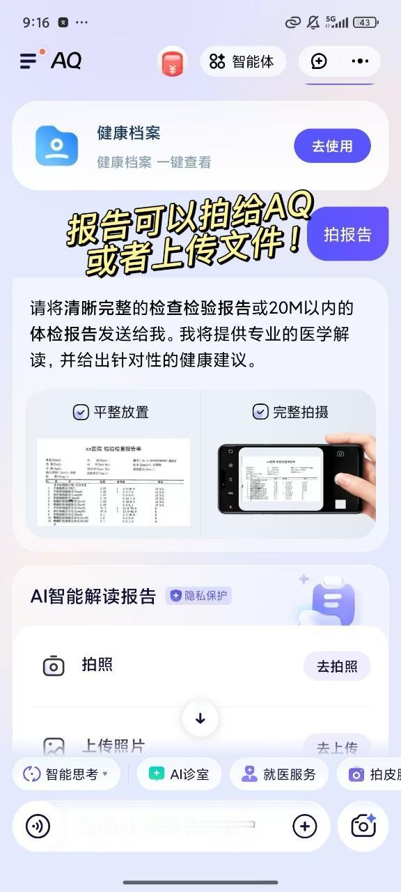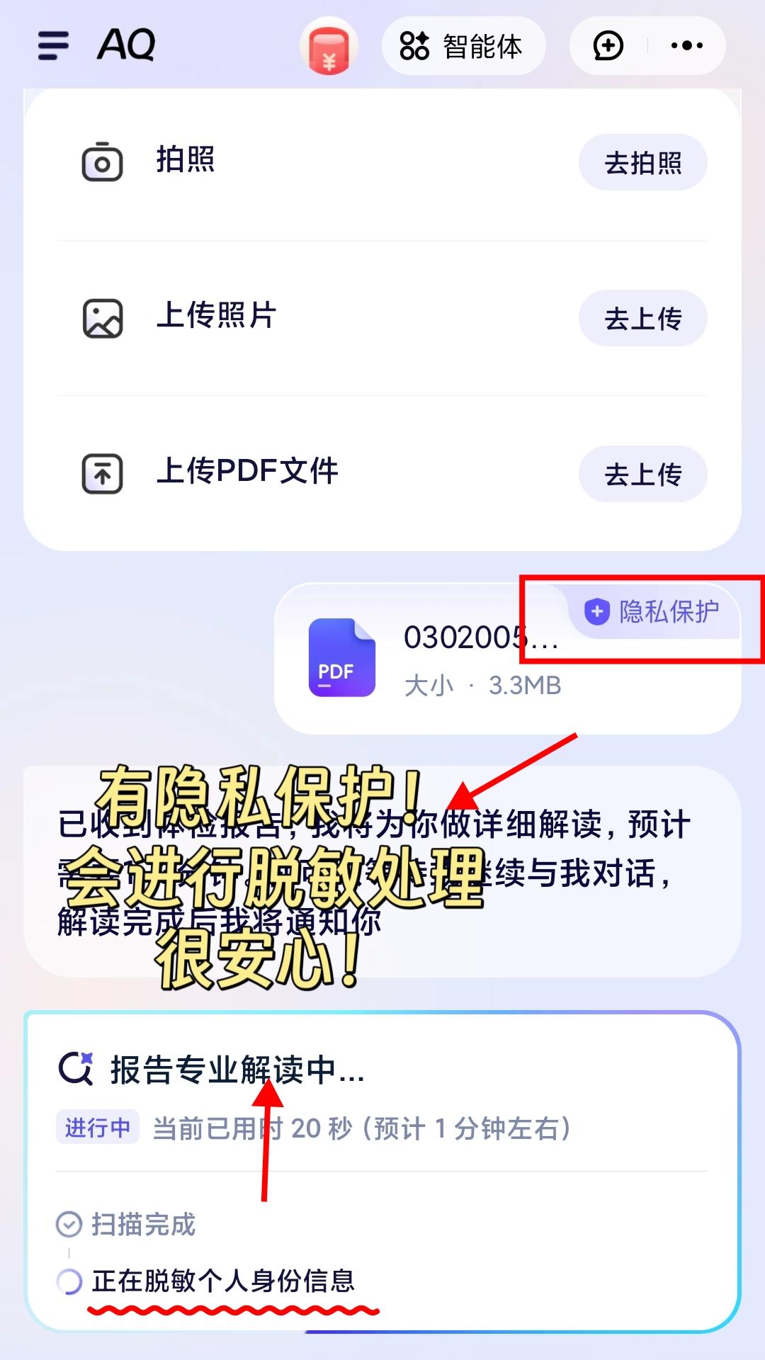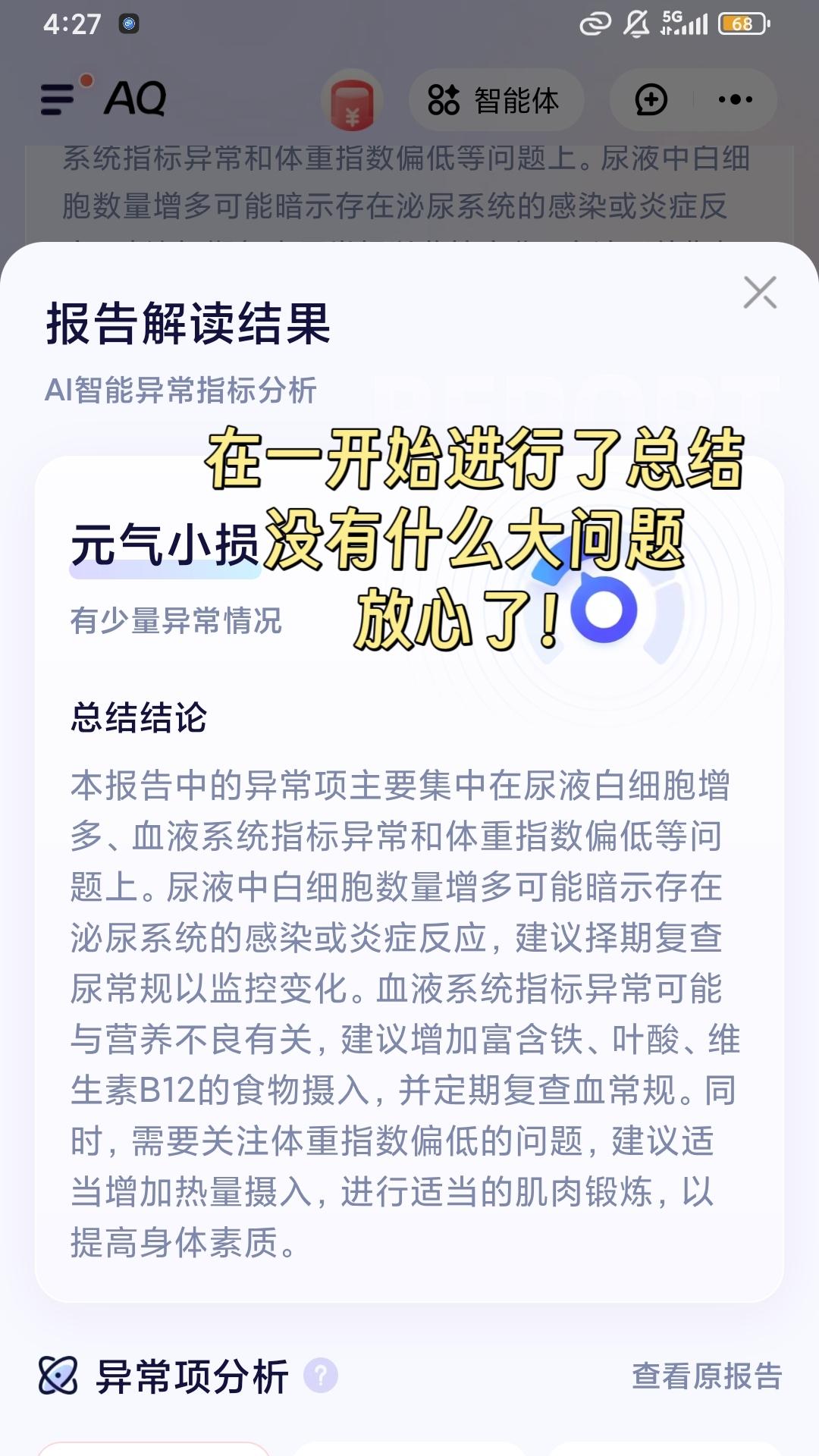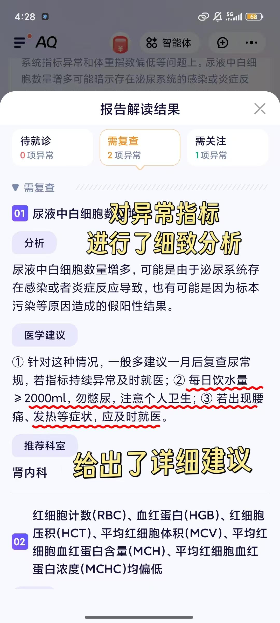 有多少人不会看体检报告?一篇教会你 体检报告拿到手一脸懵!这么多项异常!这些指标到底代表什么?每次拿到体检报告就跟天书一样,上箭头下箭头,专业术语一大堆,看到一项就要搜搜看是不是有大问题,越搜越焦虑。 就感觉哪哪都是毛病。同事让我不要瞎担心,传给AQ让它帮忙做个专业分析。我赶紧把报告上传了,大概3分钟AQ就给了专业详细的解读,而且是用通俗易懂的语言翻译,为什么会高?接下来要注意什么都会给你标注好原先提到的尿液白细胞增多还好不是特别严重,心安稳了不少。 甚至还会给你贴心推荐适合的科室,真的很干货。 为了心里更踏实,我根据AQ建议去医院进行复查。 复查完我就把检查单也传到AQ里存着,省得需要的时候不知道去哪翻,有什么不明白的又可以问AQ,现在已经是我的健康小管家了。