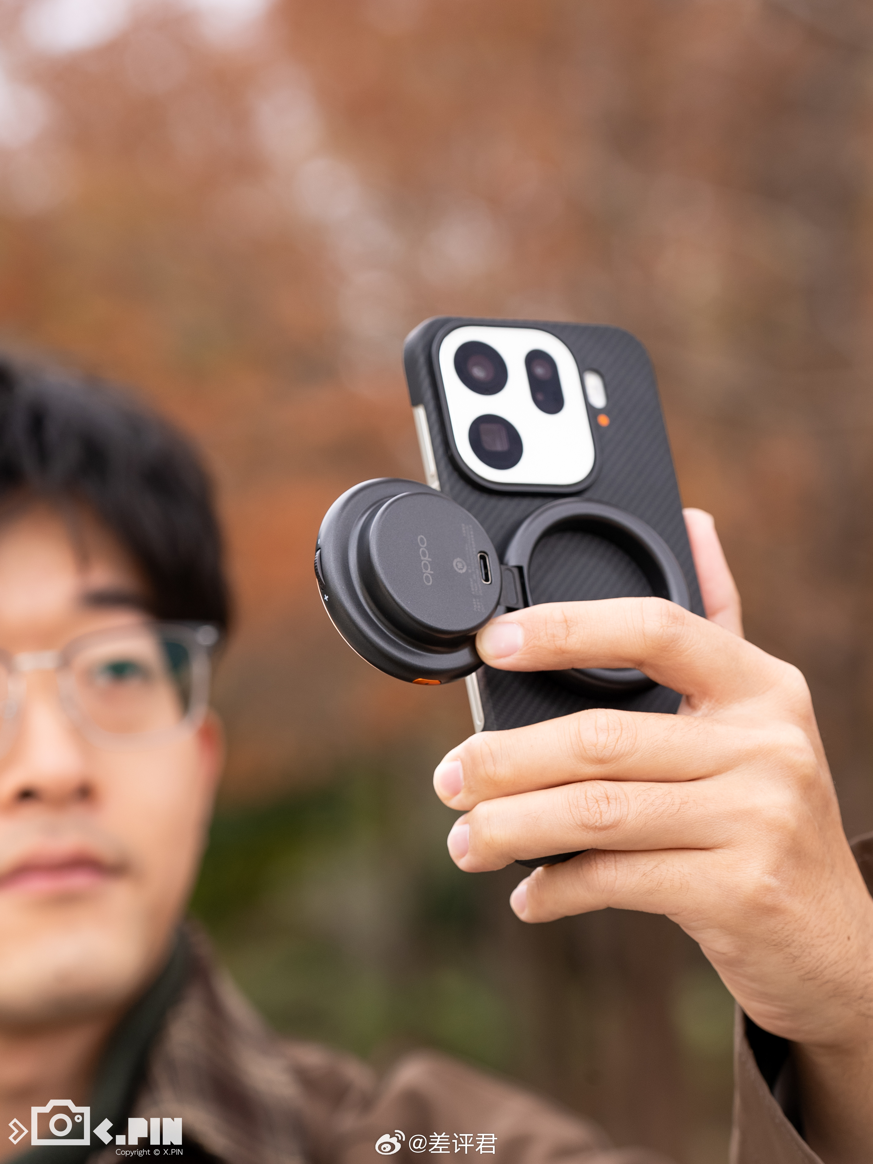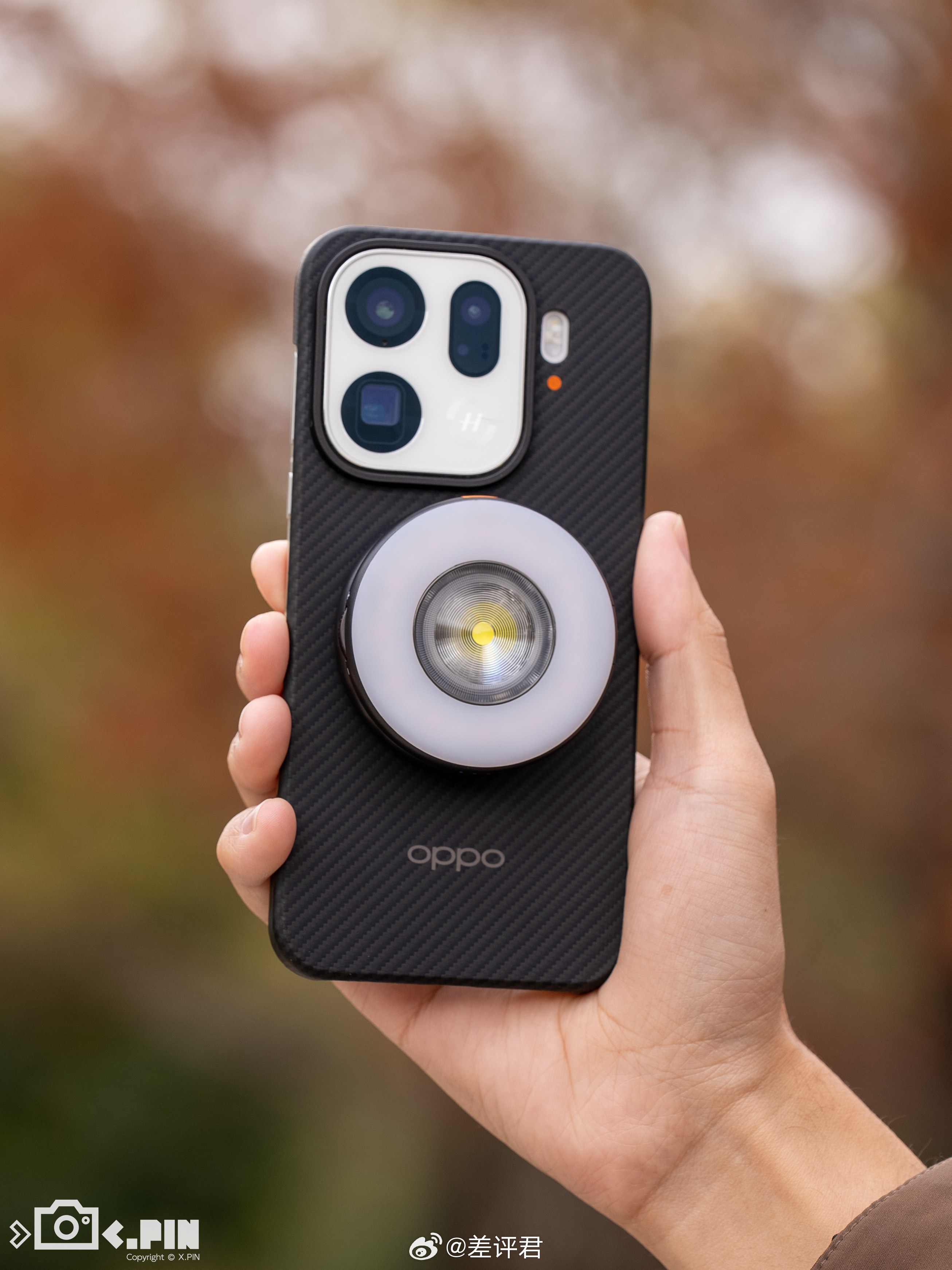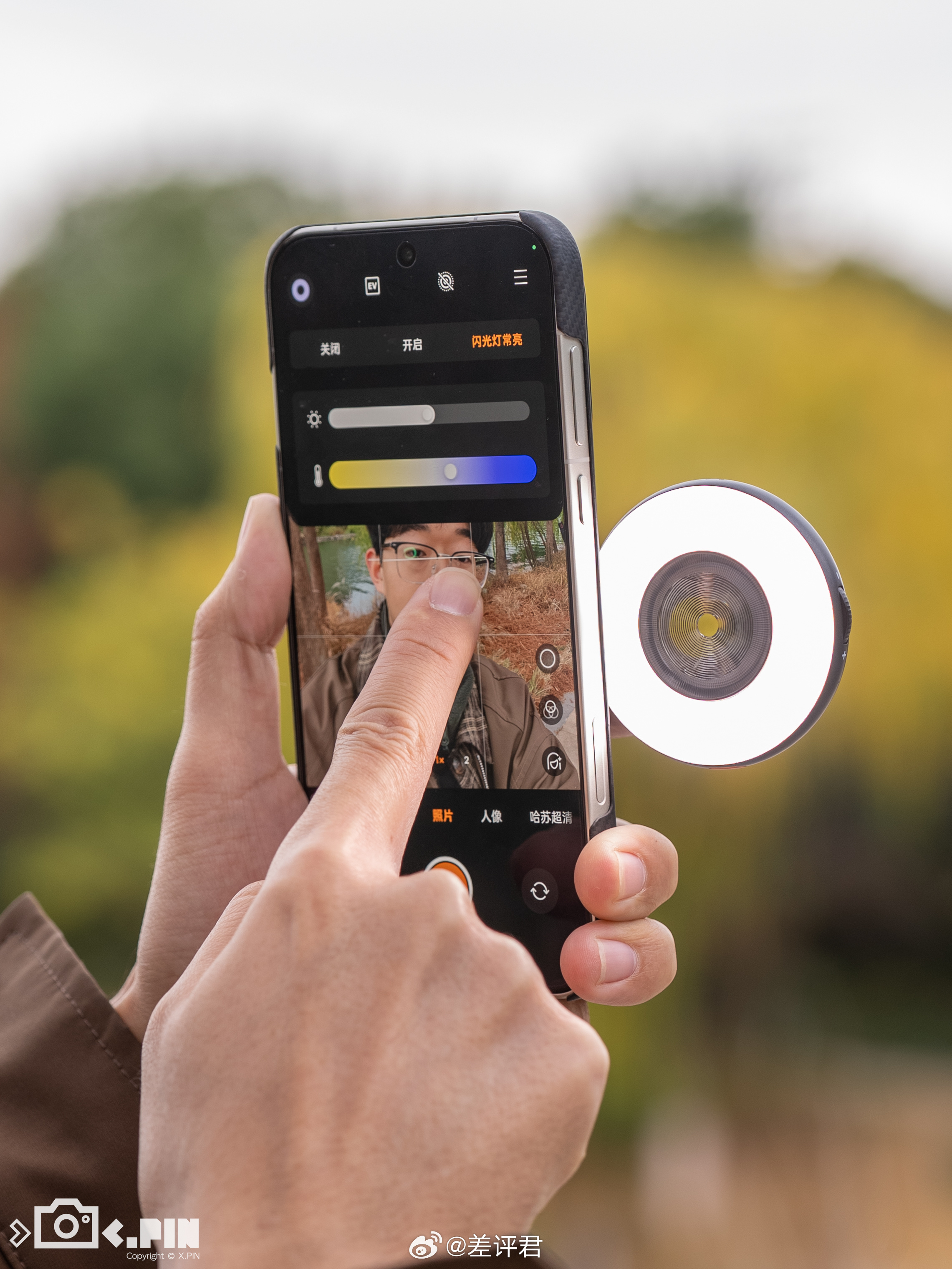 #差评说数码# 发布会过了那么久,OPPO 这个磁吸闪光灯终于开卖了,全名挺拗口,叫“哈苏专业磁吸闪补光环灯”,说白了就是闪光灯+环形补光灯的这么一个形态,可以翻转自拍。当然它最关键的地方是能跟 Find X9 系列手机搞算法联动,还能直接在手机里调参数,这点就属于第三方配件没法碰瓷的了。具体效果的话,我随机拉了个壮丁给大家试了下,图8是手机原生闪光灯,图9是磁吸闪光灯,都是在影棚比较暗的环境下拍的,人像质感这块儿确实提升蛮大。
