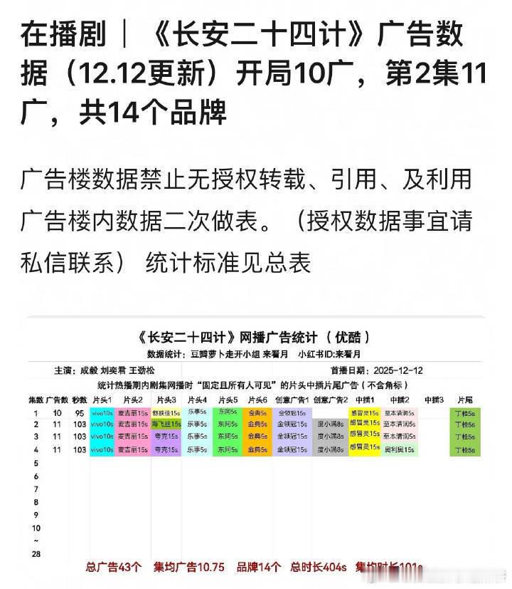 成毅《长安二十四计》开播第一集10广,第二—四集11广,品牌14个