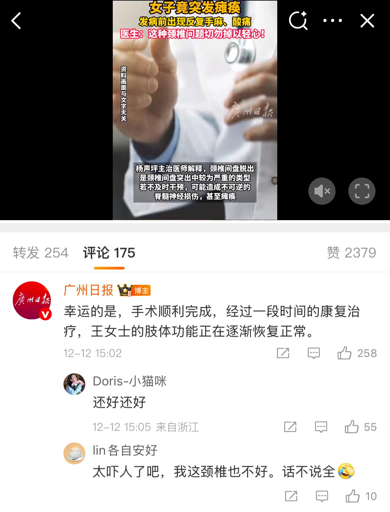 你看,媒体小编在引流这个技巧上,就是很厉害明明手术后已经有很好的恢复了,新闻正文里面就是不说,等有了流量以后放在评论区来说女子拒绝颈椎手术瘫痪热点观点 女子拒绝颈椎手术瘫痪