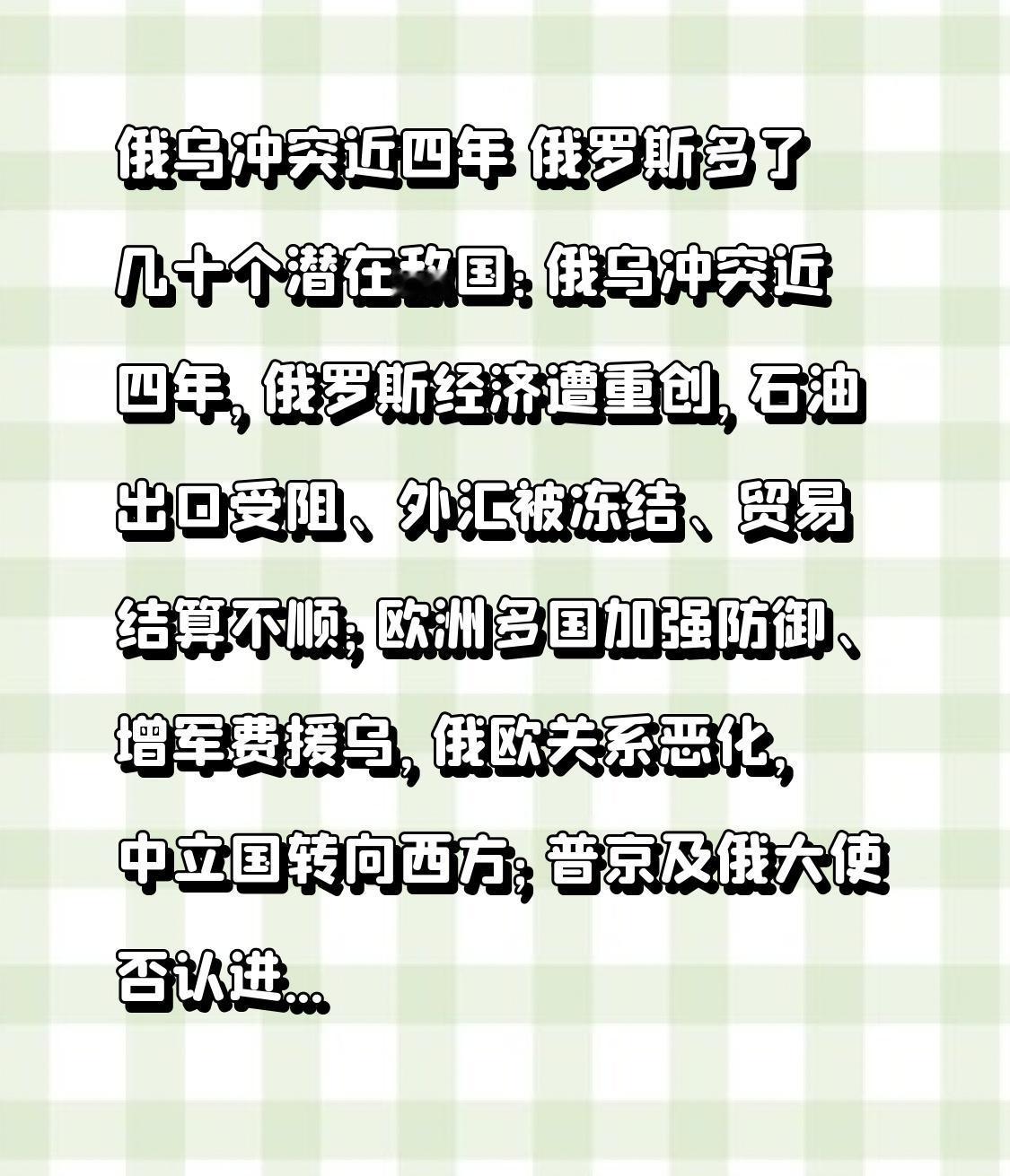 俄乌冲突近四年 俄罗斯多了几十个潜在敌国:俄乌冲突近四年,俄罗斯经济遭重创,石油出口受阻、外汇被冻结、贸易结算不顺;欧洲多国加强防御、增军费援乌,俄欧关系恶化,中立国转向西方;普京及俄大使否认进攻欧洲但难获信任,俄罗斯多了几十个潜在敌国。