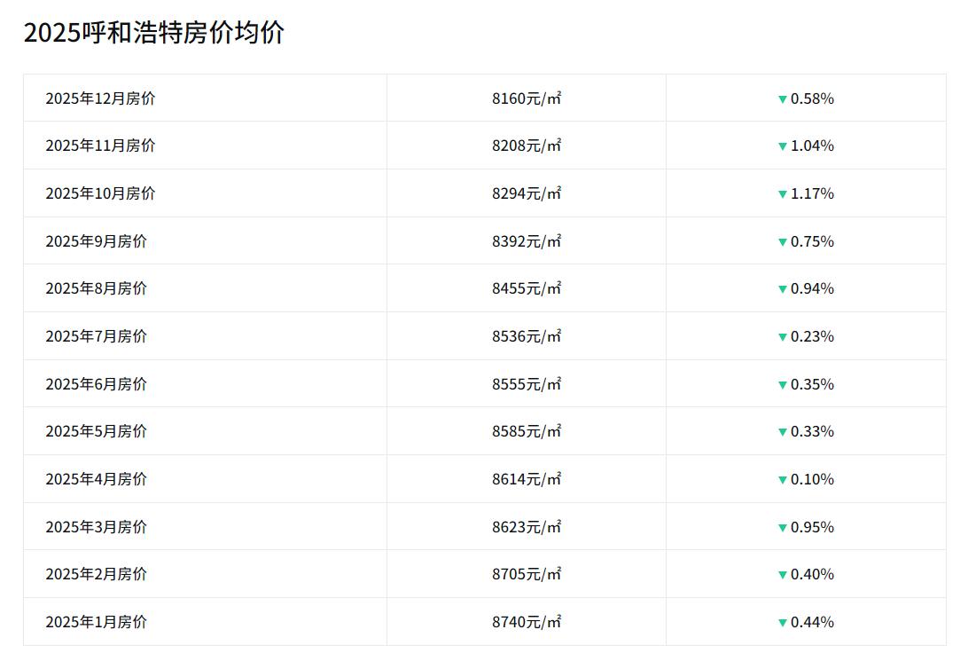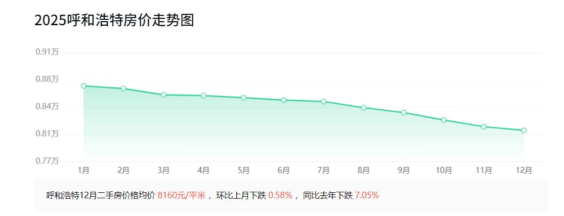 2025年1月,呼和浩特二手房均价8740元; 2025年2月,呼和浩特二手房均价8705元; 2025年3月,呼和浩特二手房均价8623元; 2025年4月,呼和浩特二手房均价8614元; 2025年5月,呼和浩特二手房均价8585元; 2025年6月,呼和浩特二手房均价8555元; 2025年7月,呼和浩特二手房均价8536元; 2025年8月,呼和浩特二手房均价8455元; 2025年9月,呼和浩特二手房均价8392元; 2025年10月,呼和浩特二手房均价8294元; 2025年11月,呼和浩特二手房均价8208元。 2025年,呼和浩特二手房均价从年初的1月到11月,整体下降了约500元。2025年11月和最高点的2020年11月份的11674元相比,整体下降了约3400元。2020年到2025年,五年间,平均每年下降约700元。 2025年前三季度,呼和浩特GDP增速5%,2024年年末全市常住人口为363.94万人,比2023年末增加3.53万人,增长0.98%。 未来,呼和浩特的房价主要还是得看经济发展、人口增长等因素,那么,大家觉得呼和浩特二手房均价在哪个区间内比较合理?评论区聊一聊。