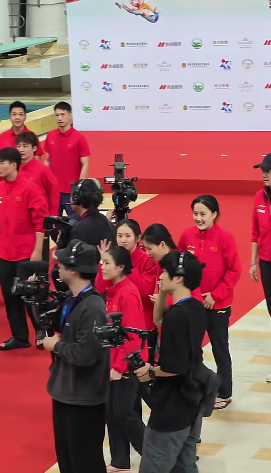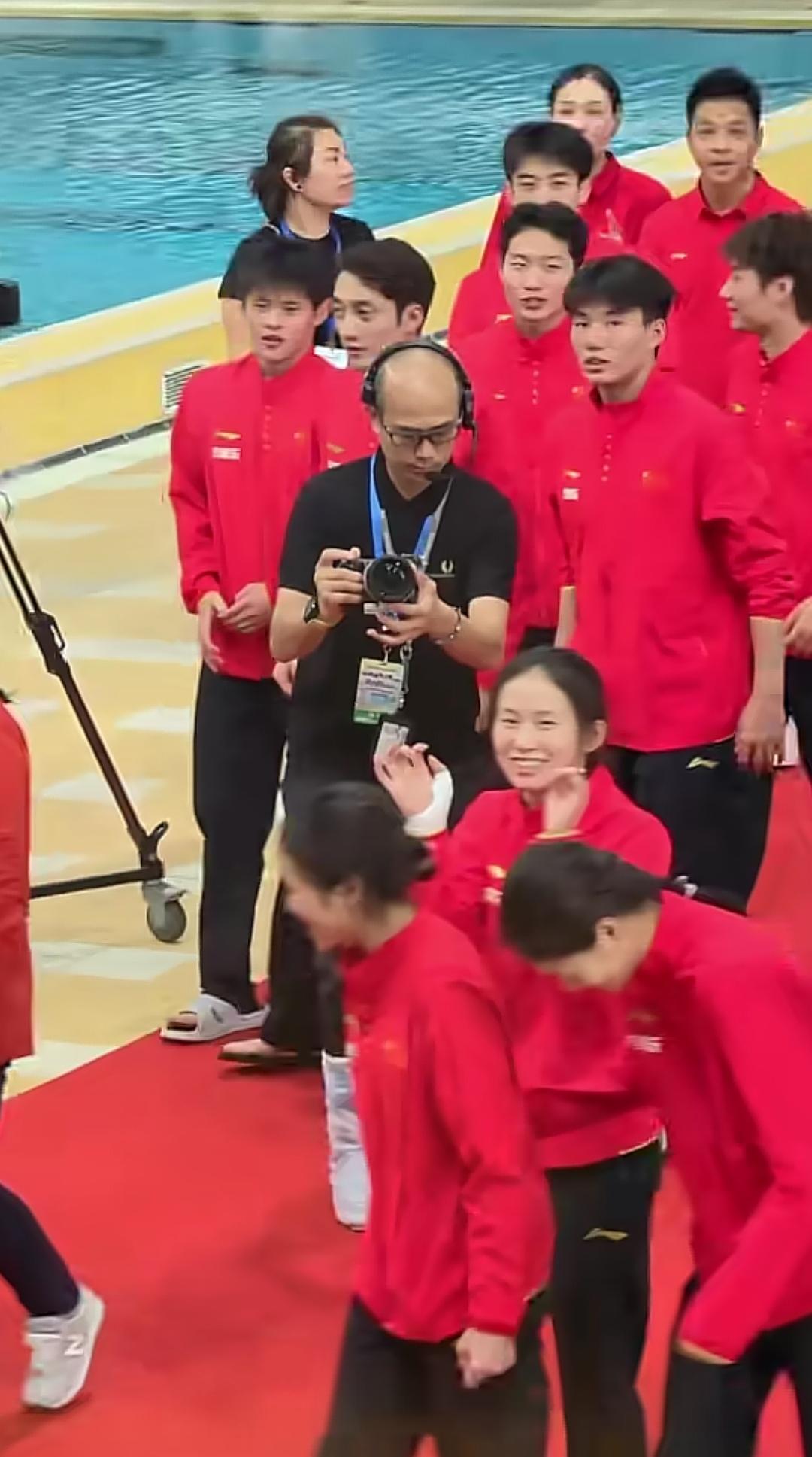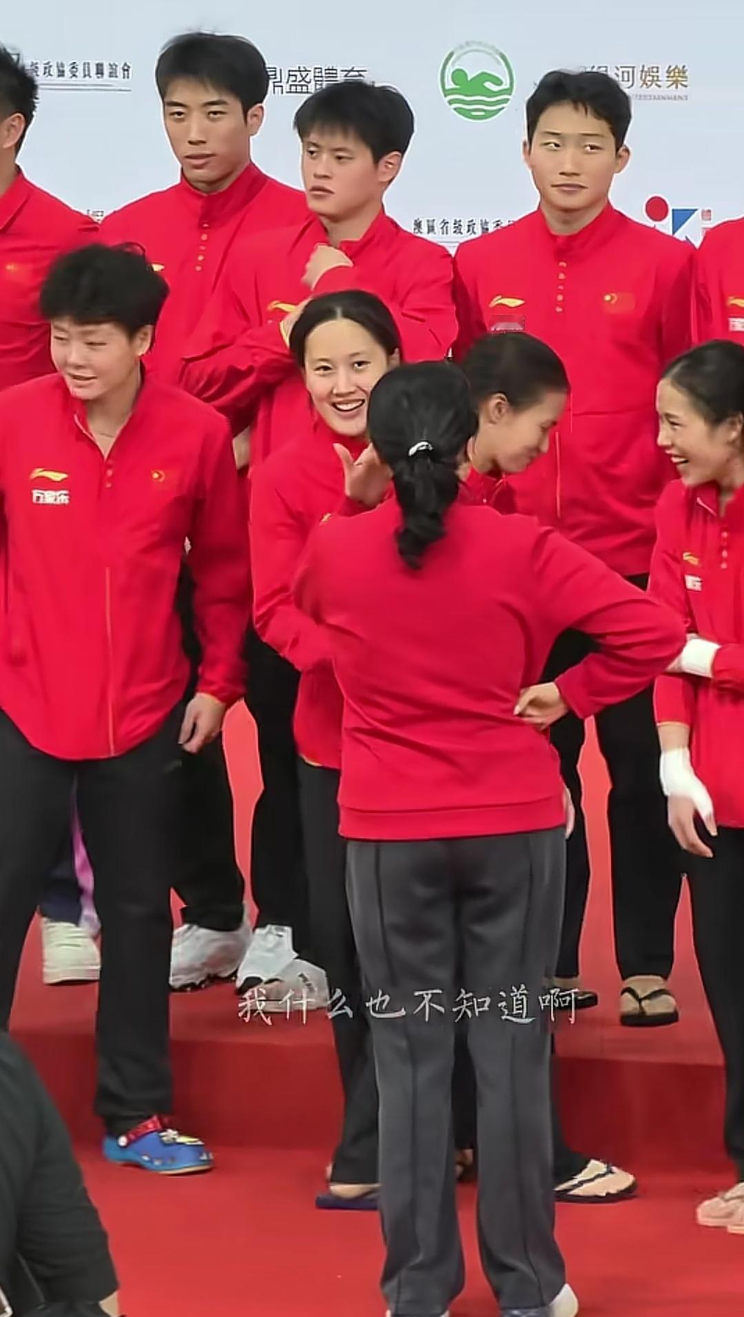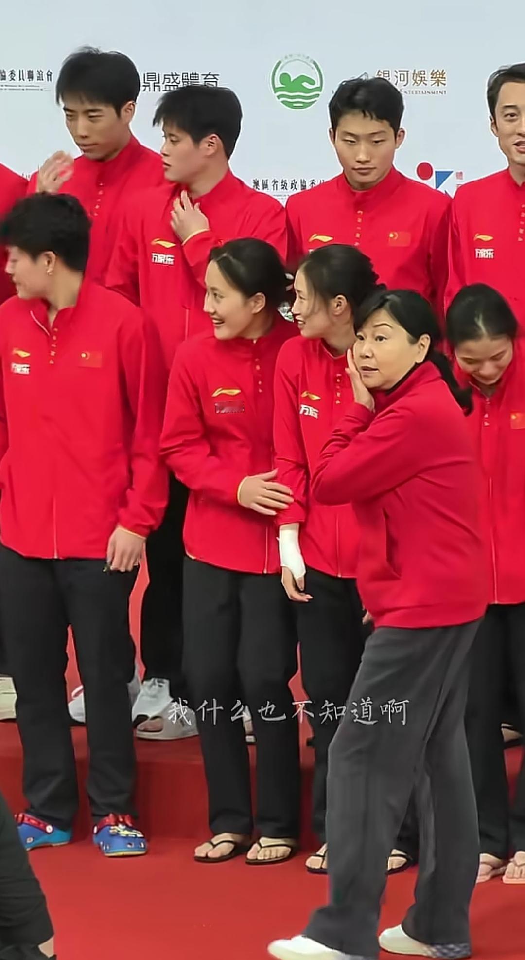 12月12日,中国跳水队运动员在澳门进行汇演了,场馆内粉丝看到陈芋汐后,热情高呼,想看陈芋汐跳水,陈芋汐看到大家的热情,开心的用两只手打招呼。 在汇演现场,铺了红毯,跳水队运动们进行集体合影,女运动员们站在前排,男运动员们站在后排位置。由于是在跳水现场,女运动员们穿着夹脚趾凉拖,陈艺文穿着可爱的洞洞鞋。 有意思的是,男生们都站好了,女生们还在“拉拉扯扯”,陈芋汐本来站在陈艺文和掌敏洁中间,不在最中间位置,掌敏洁硬是把陈芋汐拉在了最中间位置,周教练就站在前面指挥着大家排位置。