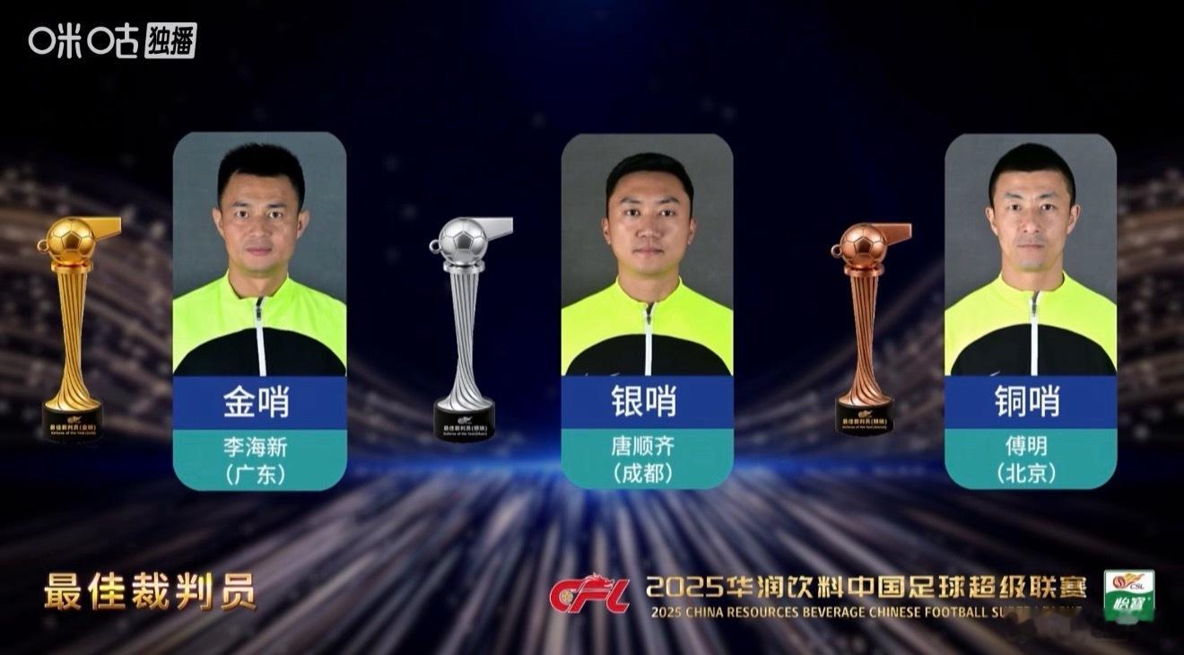 2025中超金哨李海新。银哨唐顺齐。铜哨傅明。图三是上赛季的金银铜哨。