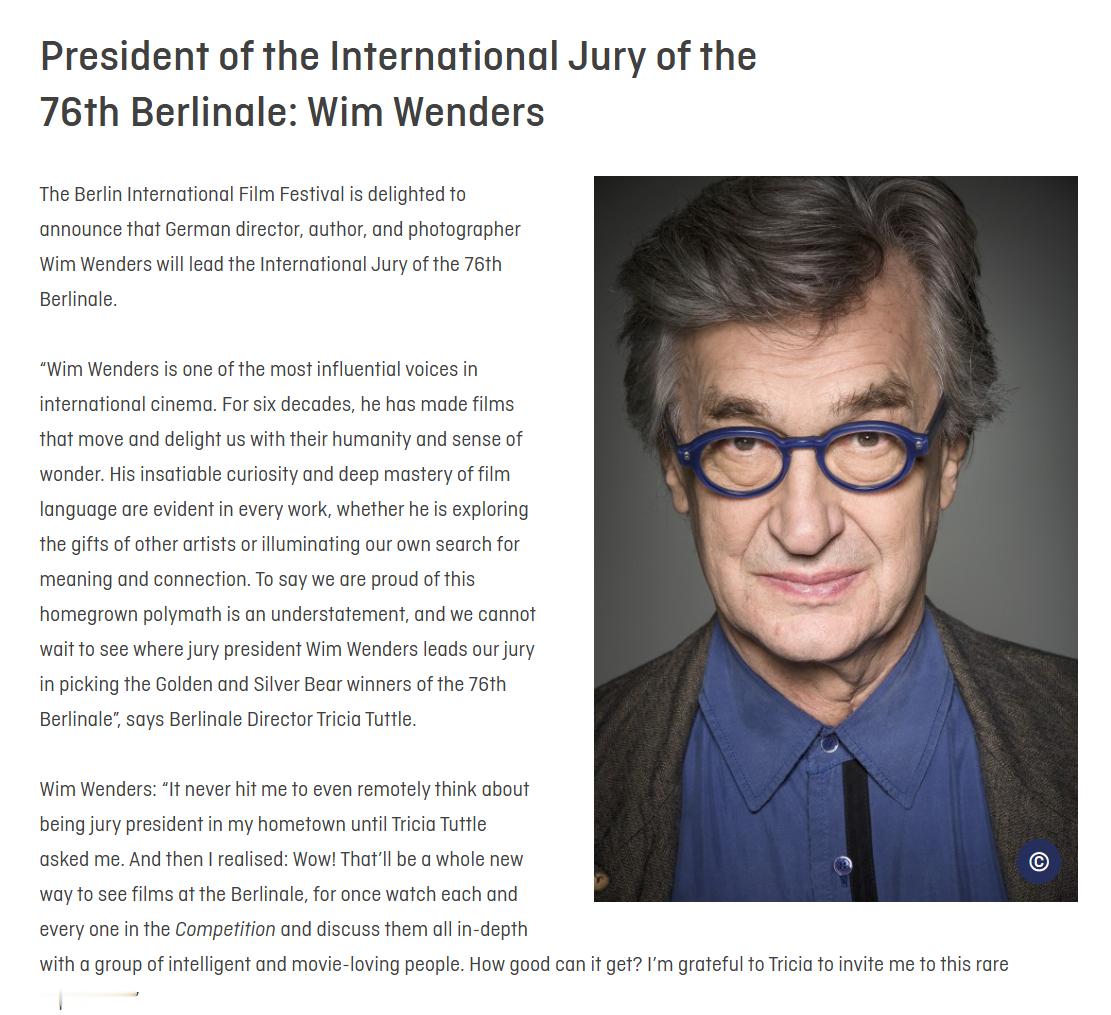 维姆·文德斯担任柏林电影节评审团主席柏林电影节宣布,德国导演维姆·文德斯将担任第76届柏林电影节竞赛单元主席,他曾凭借影片《百万美元酒店》获得第50届柏林电影节评审团奖,并获第65届柏林电影节终身成就金熊奖。更值得一提的是,维姆·文德斯曾分别担任第42届戛纳电影节、第65届威尼斯电影节评委会主席,至此他也成为欧洲三大电影节历史上第一位担任评委会主席满贯的电影人。本届柏林电影节将于2026年2月12日-22日举行。