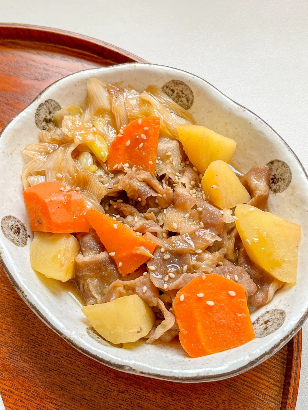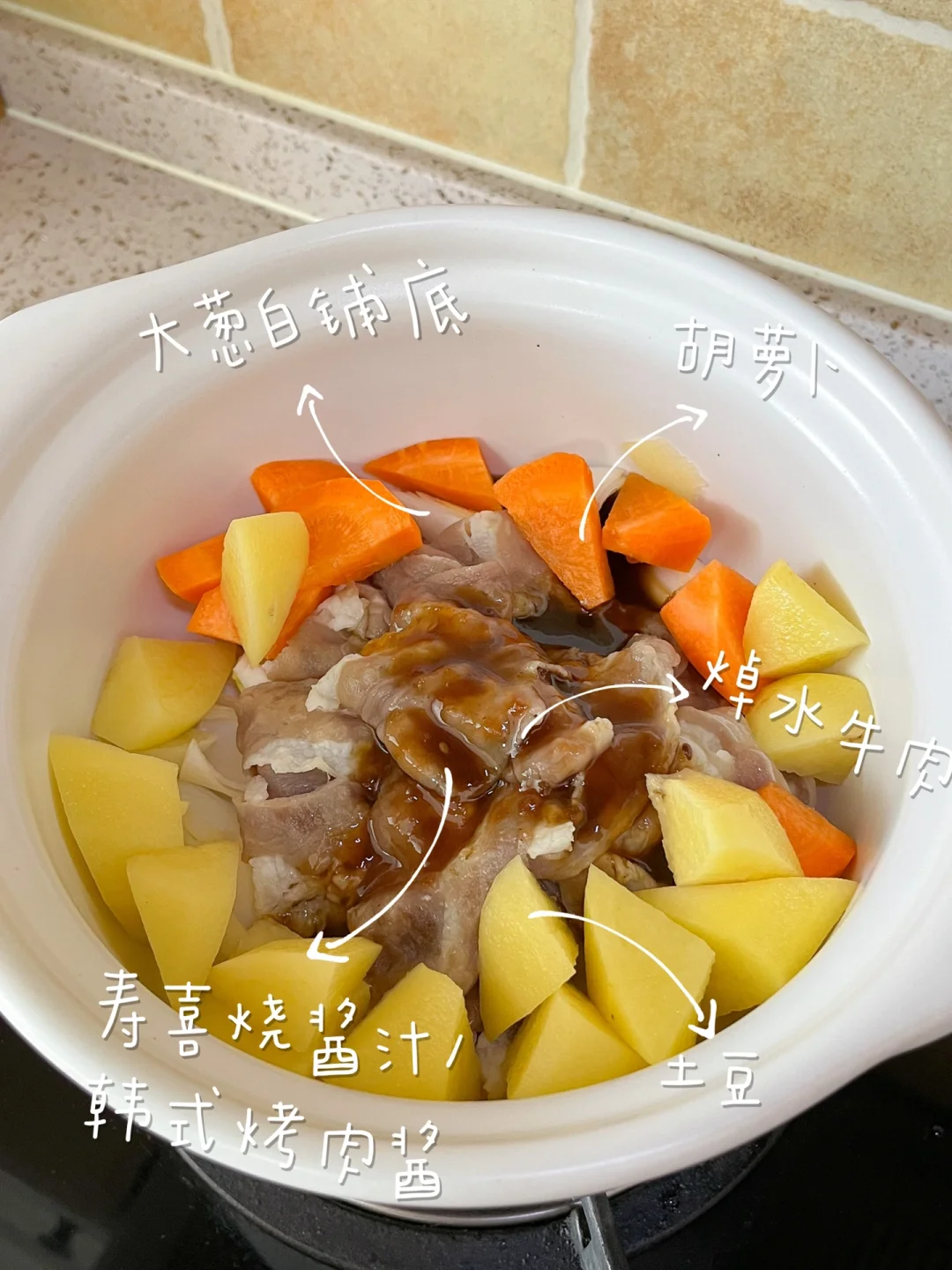 这道菜的灵魂就是大葱白,在砂锅底铺上切好的大葱白,再放上焯水牛肉,加寿喜汁或烤肉酱,切好土豆和胡萝卜,焖15分钟就好。还可以放魔芋结或粉条,吸满汤汁可好吃了
