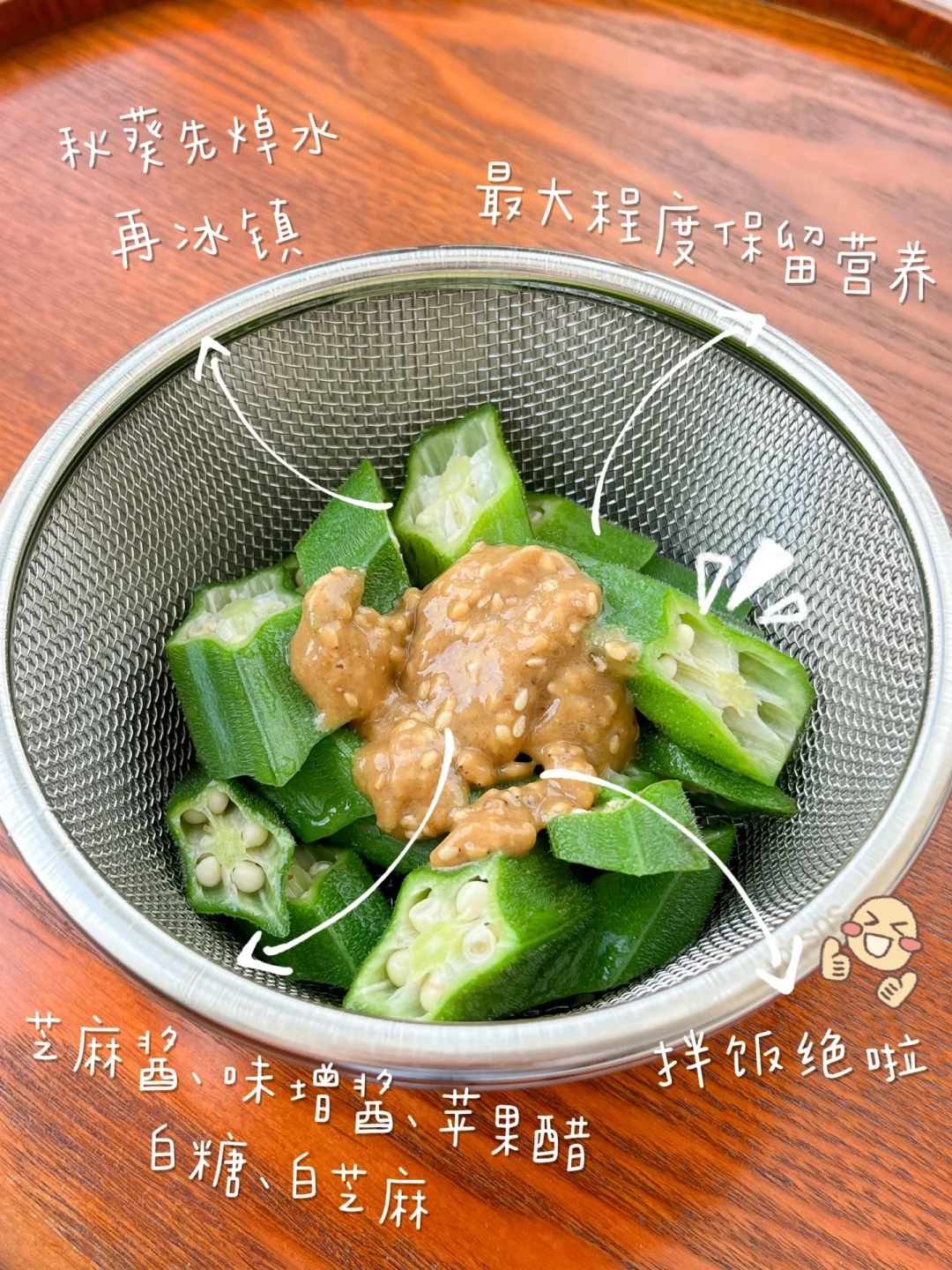 秋葵焯水后再放到冰水里,凉拌起来更爽脆。用芝麻酱、味增酱、苹果醋、白糖、白芝麻调一个酱汁,凉拌一下,简单又好吃!也能尽可能的保留秋葵的营养。