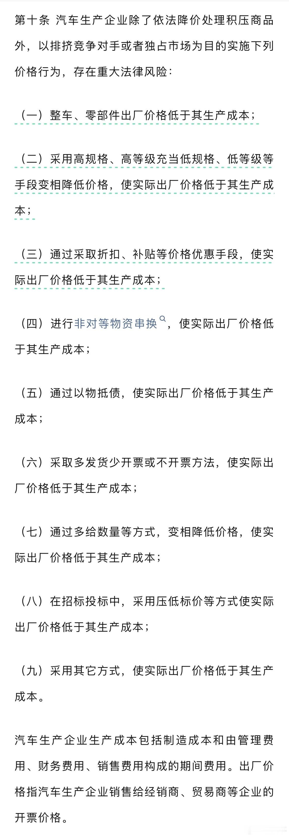 市监局发布《汽车行业价格行为合规指南(征求意见稿)》,进一步规范汽车行业价格行为:汽车生产企业生产成本包括制造成本和由管理费用、财务费用、销售费用构成的期间费用。出厂价格指汽车生产企业销售给经销商、贸易商等企业的开票价格。重点见图,其中有一条很有意思,不允许用高规格、高等级充当低规格、低等级以达成低价销售的目的。大v聊车新能源汽车