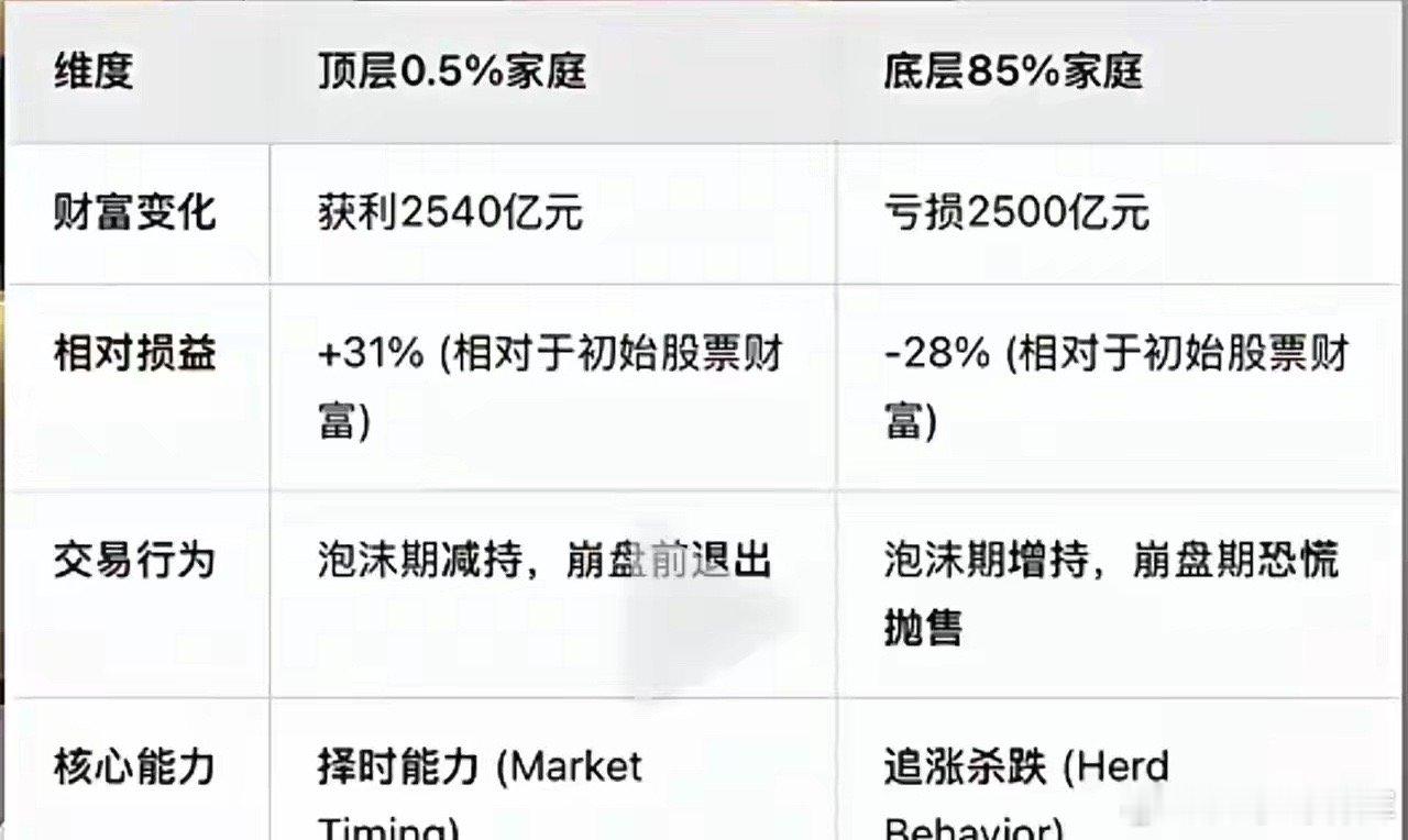 看看这个数据,再看看自己今年的表现,是不是神准了?资产10万以下的股民,99%的亏损;资产500万以上的股民,99%的盈利。光这两项对比,就很清楚了,资金大才好在股市立足赚钱。看错了还有资金加仓,亏损了还有资金再赚回来。可是小散就没那么容易了。另外一个维度,85%的家庭今年是亏损的,因为自身的原因,能力不强,心理承受不佳等等,造成亏损。股市真不是一个可以随随便便来就赚大钱的地方,凭运气赚到的钱,都会凭实力输掉。