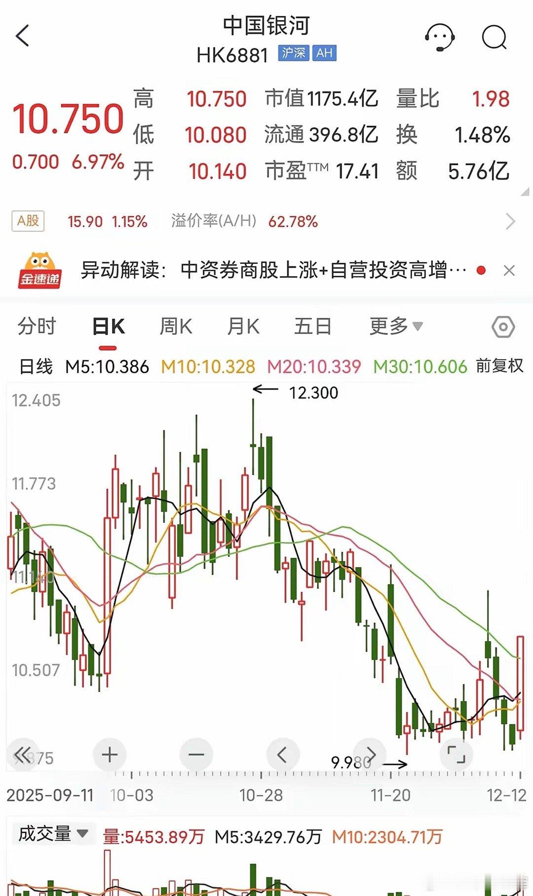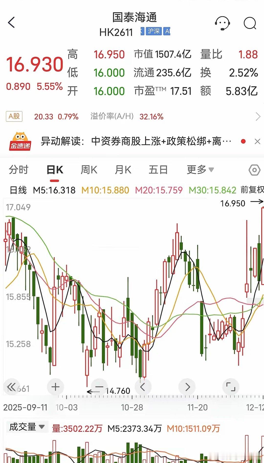 看看港股中资券商股涨幅前列股1、中国银河,涨6.97%,收10.75港币2、国泰海通,涨5.55%,收16.93港币3、中信证券,涨5.0%,收28.12港币4、东方证券,涨3.15%,收6.88港币不知道周一A股券商股是否有表现?1、东方财富2、同花顺3、指南针4、中国银河5、华泰证券6、广发证券7、中信证券8、东方证券9、国泰海通10、东北证券(声明:个人观点,仅供参考,不构成投资建议。)