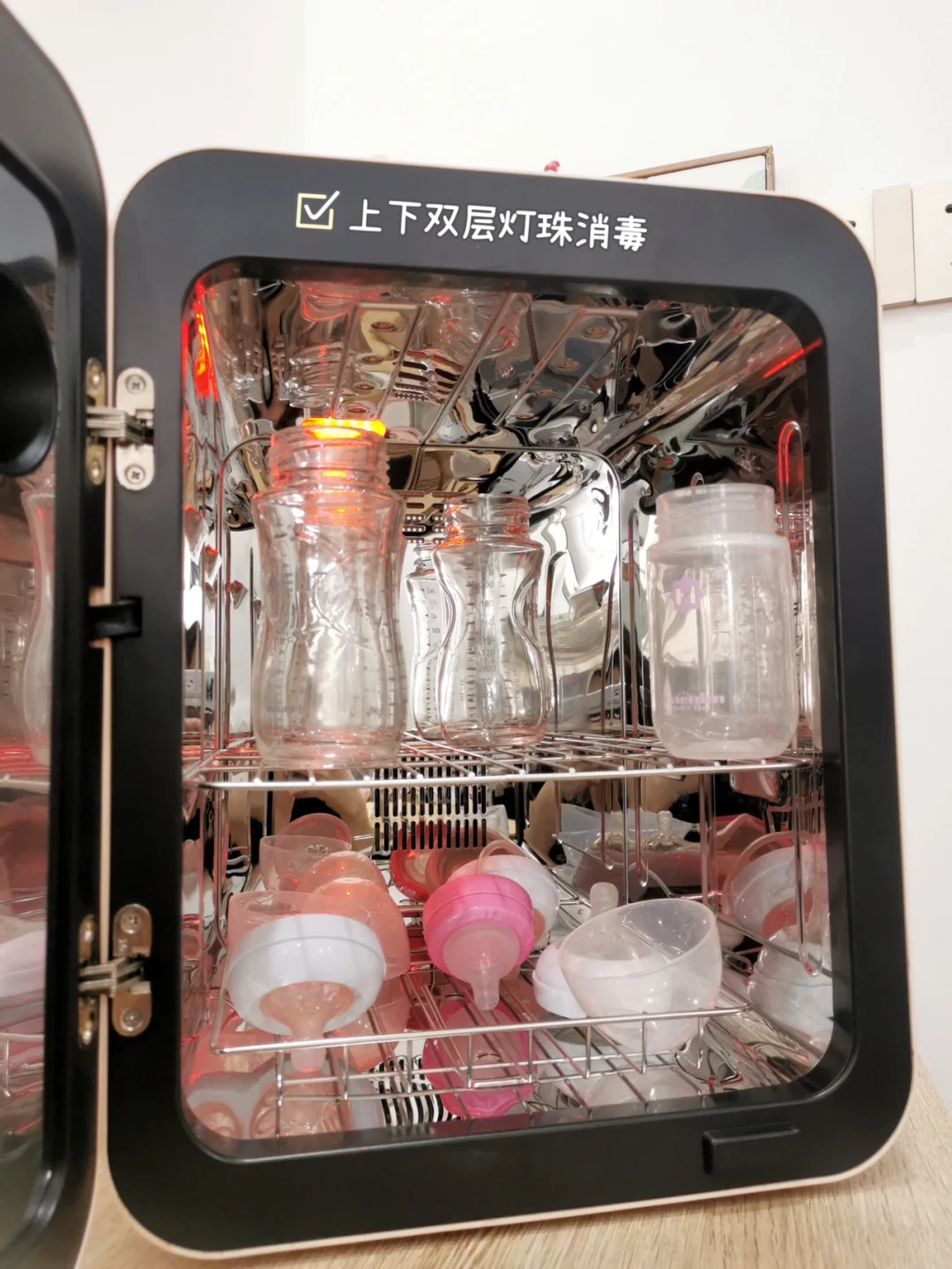 🔹另外,如果是比较忙的职场妈妈,人工做烘干消毒是不实际的,建议直接用紫外线消毒柜,比较省事省时间。我家买的大宇奶瓶紫外线消毒柜,是上下双层无汞灯珠消毒的,可一次性放置奶嘴吸奶器布偶玩具等绰绰有余,全自动烘干消毒保管,使用起来你会发现方便太多了,奶瓶清洗消毒也不过是5min的时间。