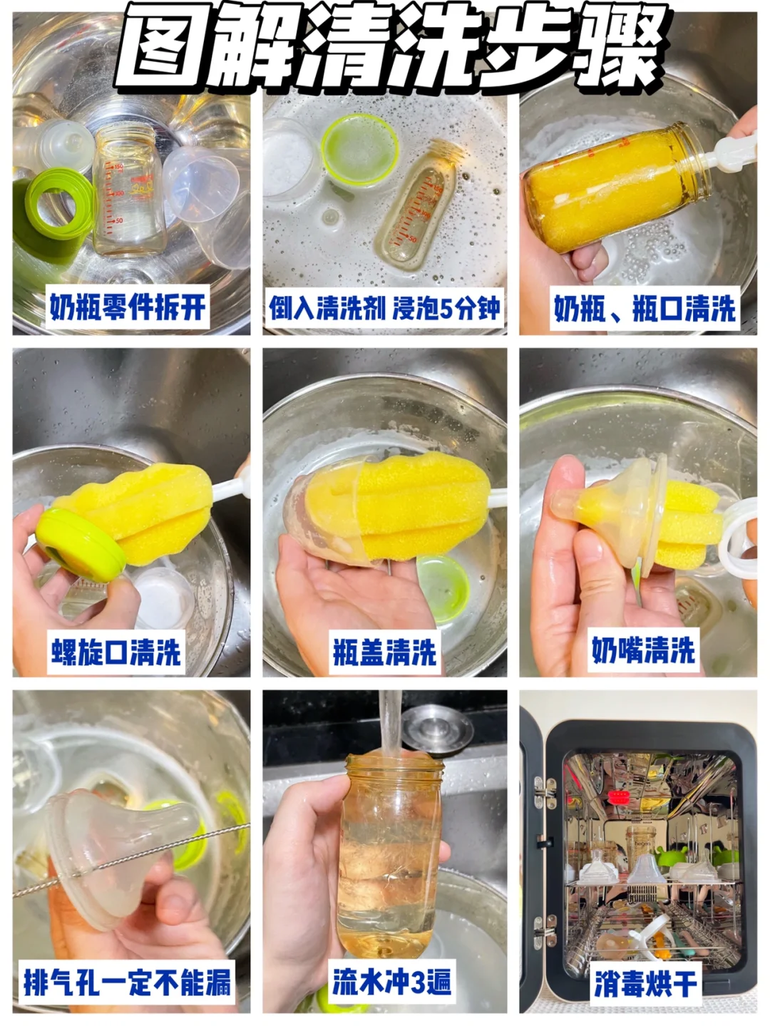 🔹奶瓶是一个及其容易藏细菌的地方,奶瓶清洗不到位留下的奶垢就是细菌的食物来源啦。所以,除了清洗要仔细,烘干消毒可以给奶瓶再增加一层保护。奶瓶清洗消毒正确三步曲,清洗、烘干、消毒一步都不能省。