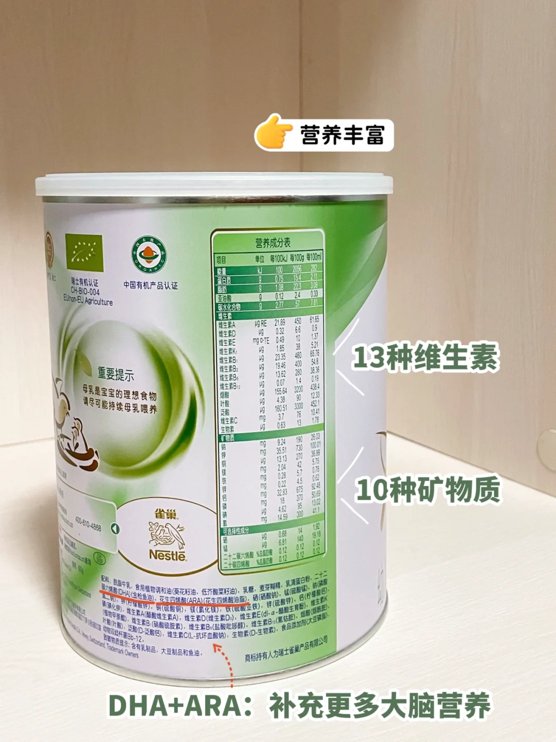 🔹而且雀巢已经150年历史了,大品牌可靠度高,另外,雀巢奶粉是阿尔卑斯雪山的黄金有机奶源,牧场不催肥,牧草⾃然⽣⻓,奶牛产出的牛奶自然更营养丰富。