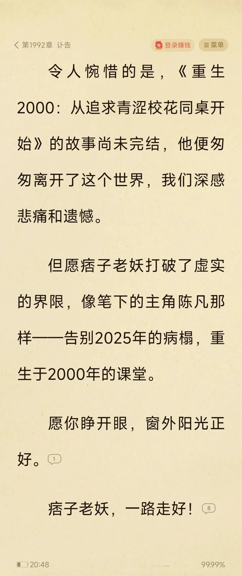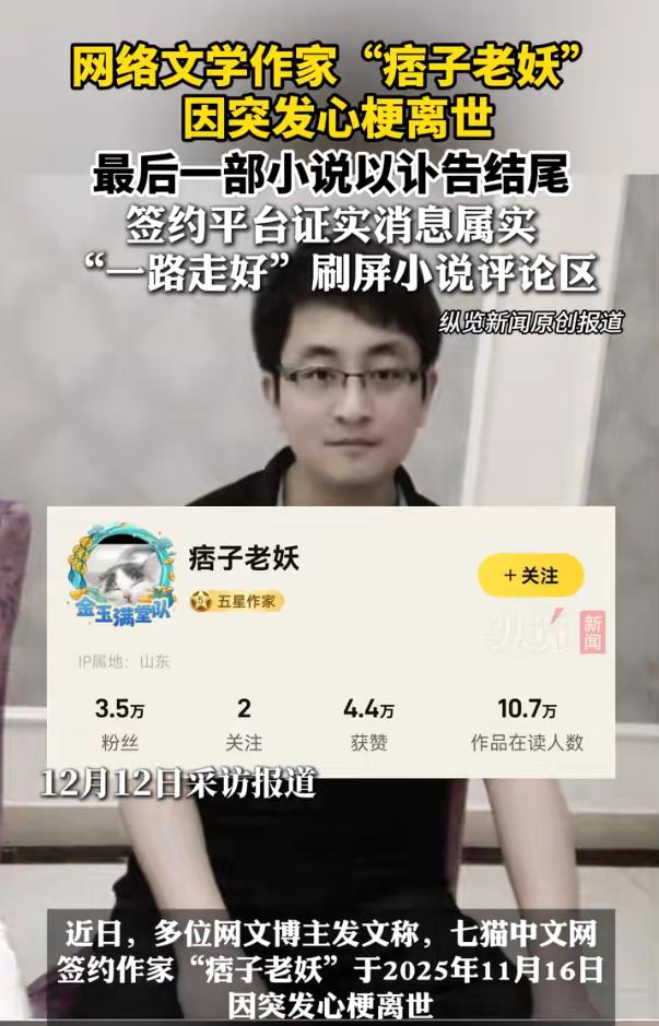网络文学作家“痞子老妖”因突发心梗离世:小说能重生,人生没续集! 《重生 2000》写到 1991 章,作者痞子老妖没能等到自己的逆袭结局。 爱人替他敲下讣告的那天,全网追更的读者突然发现,书里写尽了弥补遗憾的爽文剧情,书外却是再也无法续写的人生。11 月 16 日的心肌梗塞,让这个日更六千字、四年写了 630 万字的网文作者,永远停在了 42 岁的冬天。 网文圈从不缺拼命的故事。有人像血红那样一天狂码 9 万字,有人学志鸟村跪着写缓解腰痛,95 后作者为还百万外债凌晨四点起床赶稿。我们总说 “细水长流”,可键盘敲得噼里啪啦,心脏却在偷偷报警。痞子老妖不是第一个倒下的,多年前格子里的夜晚独自在家猝死,十天后才被发现,他小说里主角过劳死后穿越,现实中却没有重来的机会。 你以为在透支时间换稿费,其实是在预支生命。那些凌晨三点的咖啡,那些为追数据硬扛的疲惫,那些 “再写一章就睡” 的自我妥协,都在悄悄刻下健康账单。读者追更时催的 “加更”,平台要的 “日更保底”,最后都变成了压在作者身上的稻草。可钱赚得再多,也买不回一次重新开始的机会。 写作是场马拉松,不是百米冲刺。匪我思存早就说过,行业里过劳死的案例太多,所以再忙也要抽时间游泳滑雪。真正的长久,从来不是拼谁更狠,而是谁能走得更远。就像痞子老妖笔下的主角能回到过去弥补遗憾,我们却连一次 “好好睡觉” 的后悔药都买不到。 别等身体发出警报才想起停手。稿子可以慢慢写,钱可以慢慢赚,唯独生命没有暂停键。今天能按时吃饭,就别凑活外卖;今晚能早点闭眼,就别硬熬通宵。你笔下的故事再精彩,也不如自己的人生完整。 你有没有为了赶稿熬到天亮?或者因为过度拼命让身体亮过红灯?如果能给过去的自己发一条消息,你最想劝当时的自己放下什么?来评论区聊聊,愿我们都能写完自己的人生长文,而非仓促停笔。