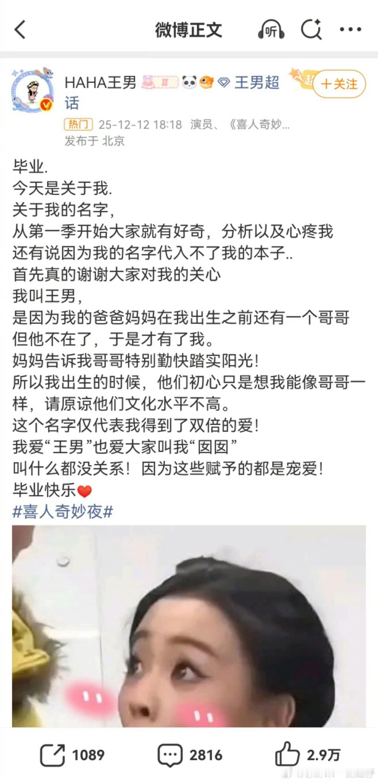 王男回应名字由来喜人奇妙夜 原来囡囡名字背后藏着这么温暖的故事!本子里满是家庭爱意,完全不影响代入。她勤快又阳光,不管是王男还是囡囡,都是带来欢乐的宝藏,未来一定会更棒!