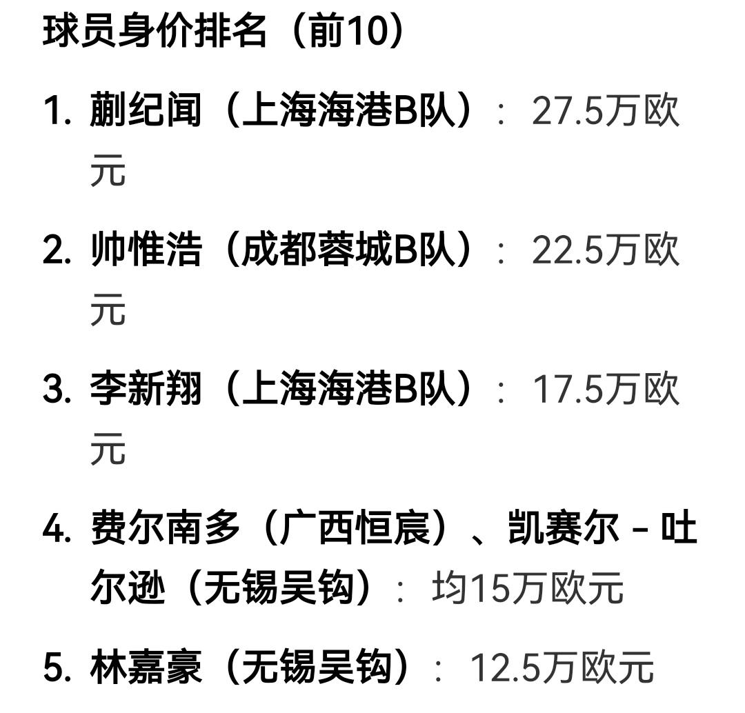 成都蓉城帅惟浩夺得一项亚洲第一!蓉城小将帅惟浩不但刷新了中国职业联赛最小年龄进球纪录,更是在最新一期德转身价排行榜以22.5万欧排名09年龄段球员身价亚洲第一(世界09年龄段球员身价第22位),这个蓉城小将未来可期。