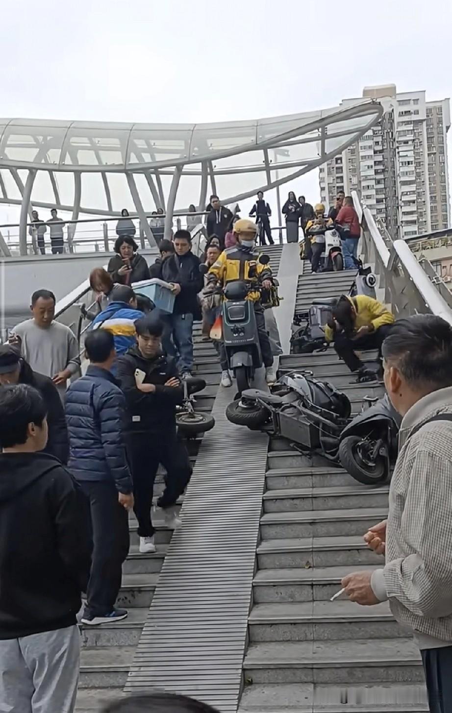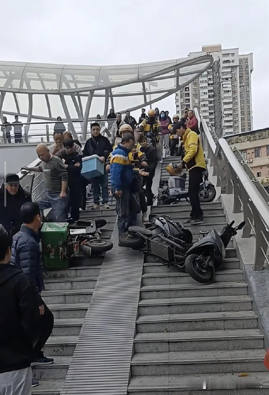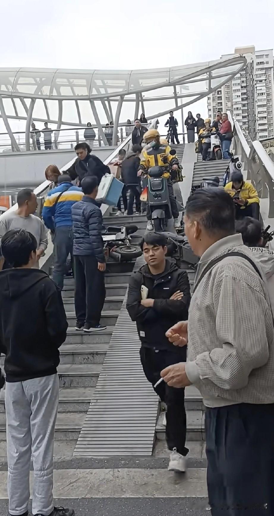 天桥上的外卖员对峙!为小事互不相让,讨生活的人何苦为难彼此? 天桥台阶上的一幕看得人心里堵得慌:两辆外卖车歪倒在台阶上,两名外卖员脸红脖子粗地对峙,嘴里喊着“谁也不让谁”,周围围了一圈看热闹的人,连其他外卖小哥都停下车子围观,现场气氛紧张得像要随时动手。 外卖员风里来雨里去,挣的都是辛苦钱,不过是通行时的小剐蹭,犯得着在街头争得面红耳赤?大家都是为了讨生活奔波的人,本应互相体谅,结果却因为一点小事闹僵,既耽误了送餐,又坏了心情。 说到底,不过是一时的气盛和放不下的面子,可在生存的压力面前,这点面子又算得了什么? 那么问题来了:你觉得外卖员之间的这种冲突,是该争个对错,还是各退一步?