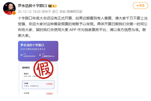 【罗永浩紧急提醒罗永浩呼吁举报售卖假票商贩】发文提醒称:十字路口年底大会还没有正式开票,如果近期看到有人售票,请大家千万不要上当受骗,欢迎大家对这种售卖假票的商贩予以举报。