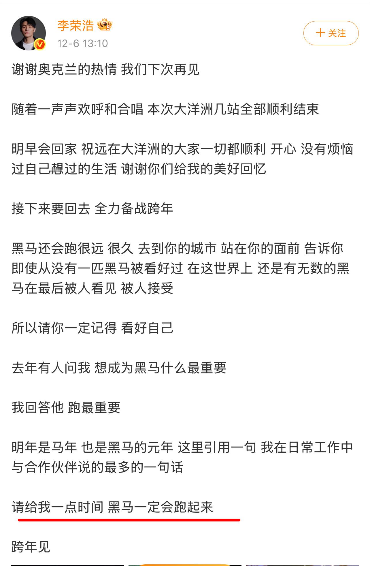 李荣浩说到 李荣浩做到 李荣浩说到李荣浩做到,明年也好多好多城市都安排上了,去到你的地方,站到你的面前,告诉你黑马一定会跑起来