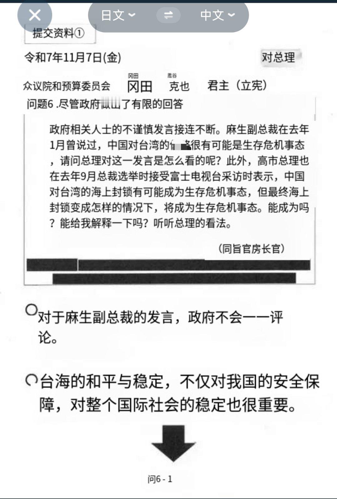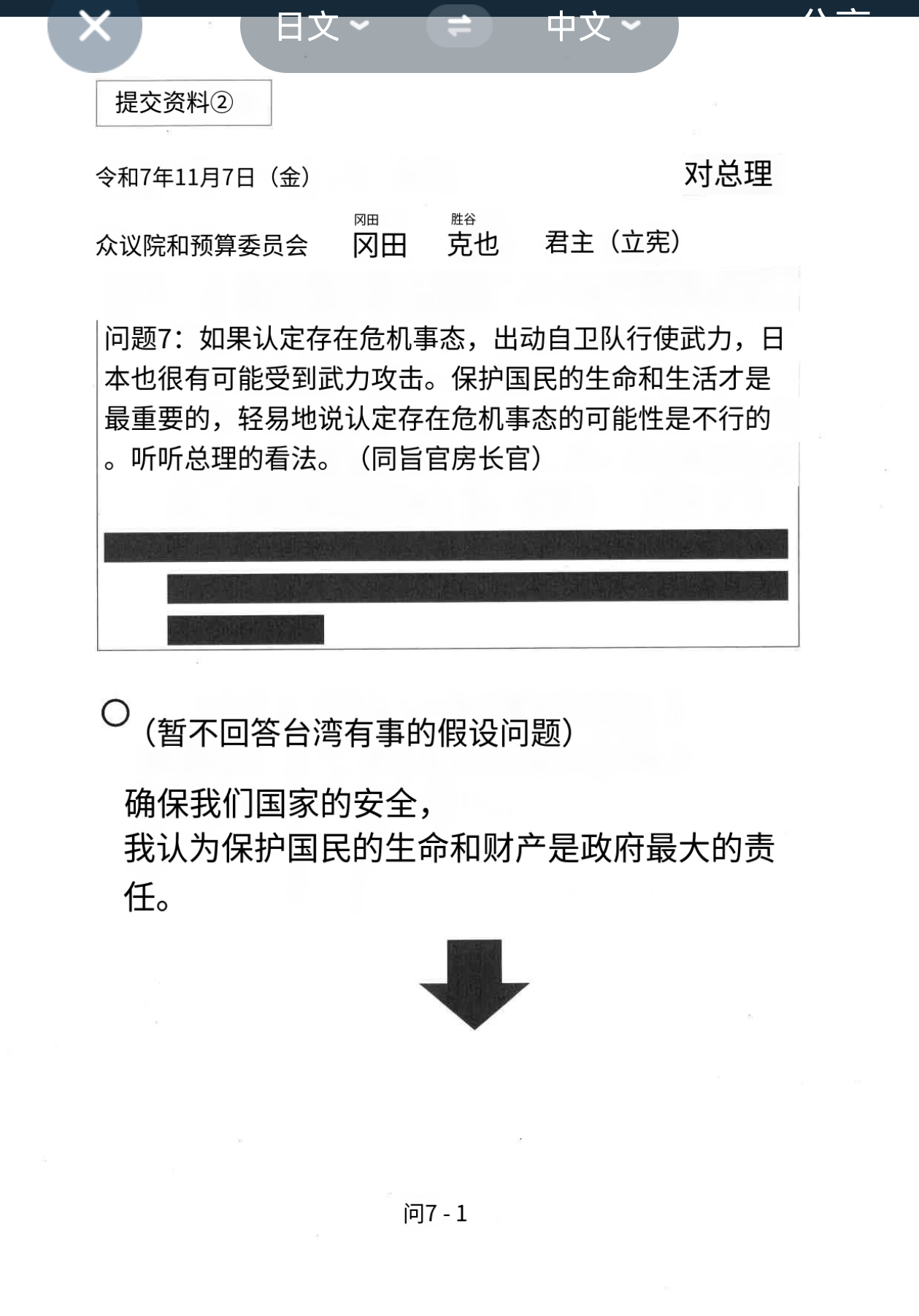 日本内阁官房为高市早苗11月7号国会答辩准备的稿件被日本媒体曝光,原稿中要求高市早苗不要对有关麻生太郎所谓“台海局势可能造成日本存亡危机”言论相关的问题进行回答,同时对台海局势相关问题准备了一系列的公式式的回答,但是显然作为右翼的高市早苗决定“遵从内心”,“独走”了。热点观点烽火问鼎计划外交部再提醒避免前往日本