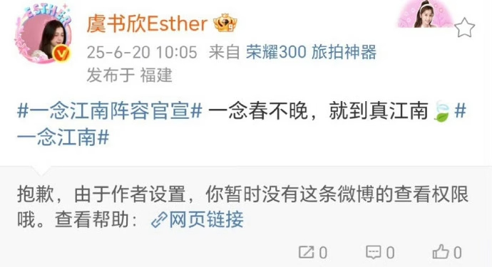 一念江南删除了虞书欣官宣博删除了不是很正常?虞书欣前段时间的负面新闻太多了吧?艺人还是要爱惜自己的羽毛~