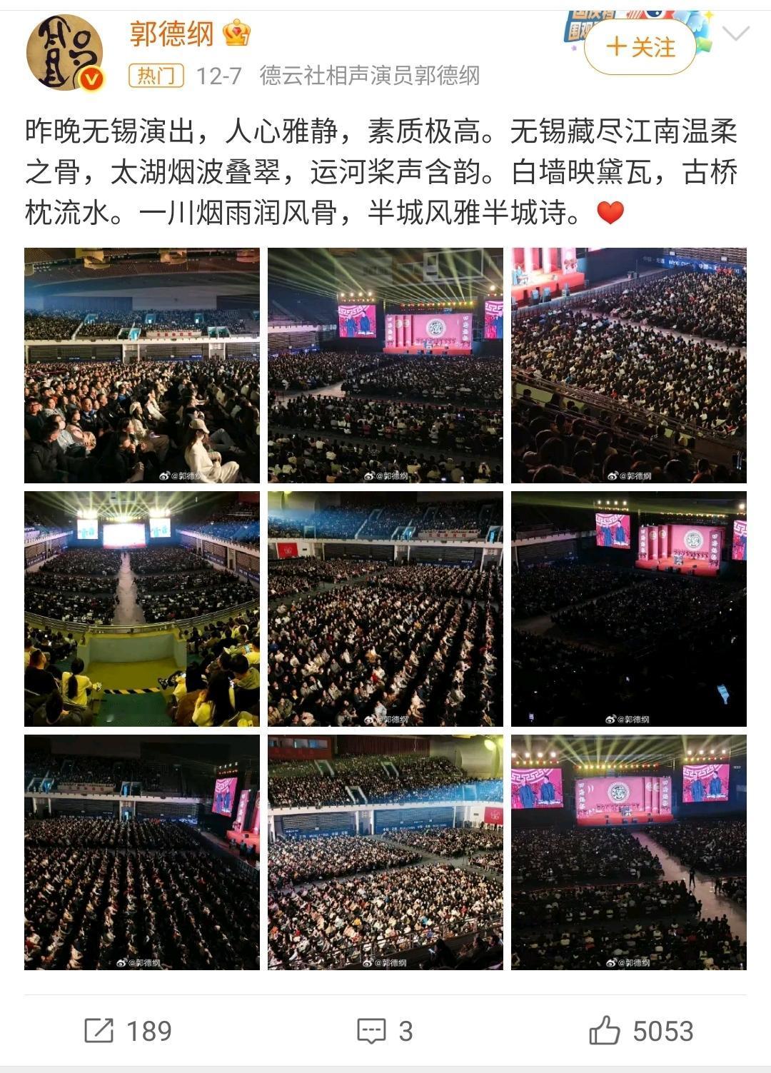 青曲社的苗阜比起德云社的郭德纲来,始终还差点意思。 相声水平怎么样放一边,就说这个拍照的方式,就有点露怯了。 人家德云社郭德纲演出的时候,表演完在网上放的都是观众席的照片。 满坑满谷,人山人海,座无虚席。 说明人家人气和和卖票的能力确实强。 苗阜同样是四处演出,拍的照片却是舞台上的。 虽然说也很好看,但是,很多网友难免心里有疑问,台下到底有有多少观众啊?