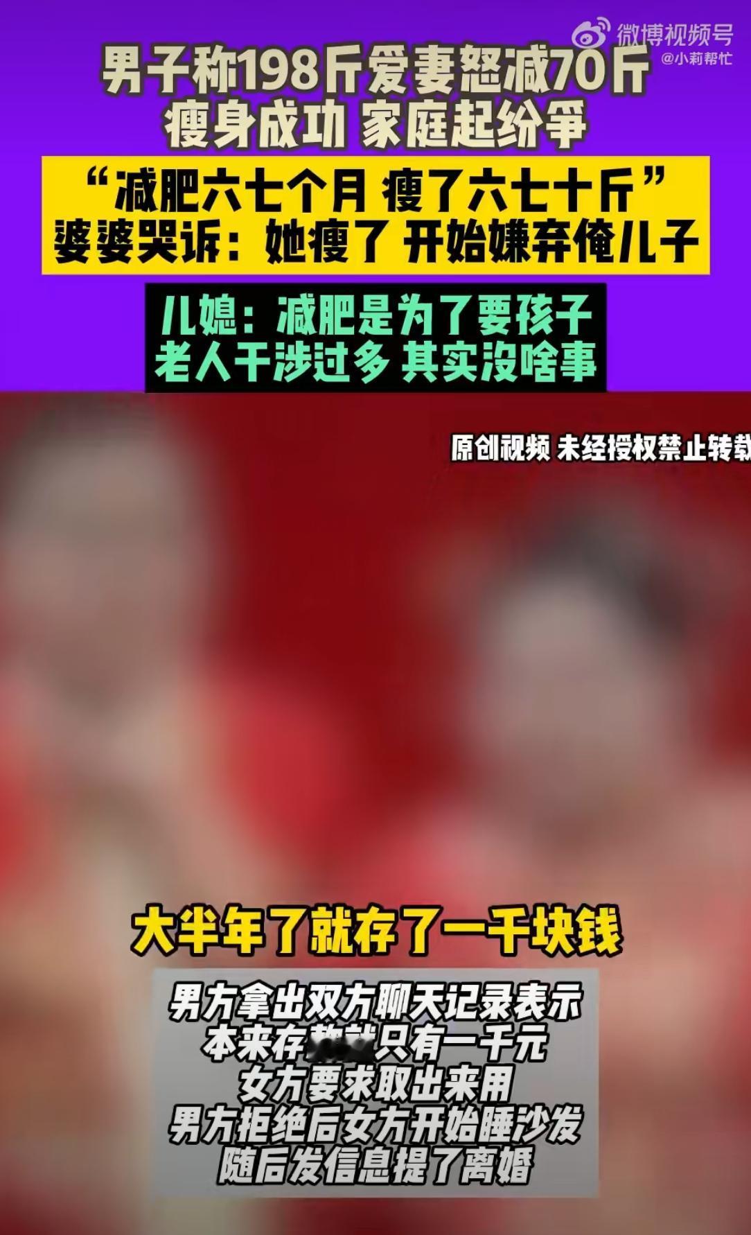 198斤新娘花丈夫钱减肥70斤后坚决离婚!婆媳各执一词,网友吵翻了! 河南焦作一场“减肥引发的离婚风波”刷爆网络!结婚刚满一年的新婚夫妻,因妻子减肥70斤后提出离婚,让婆婆和儿媳站在了对立面,双方各执一词的控诉,引发全网热议。 事情要从一年前说起。据婆婆郑女士讲述,儿媳刚结婚时身高1米6左右,体重高达198斤。婚后为了顺利备孕添丁,儿媳下定决心减肥,整个过程持续了六七个月,减肥所需的花销,以及日常吃喝拉撒的费用,全靠儿子每月5000多元的打工收入支撑。功夫不负有心人,儿媳成功减掉70斤,身形实现翻天覆地的蜕变。 可让郑女士没想到的是,儿媳瘦下来后态度也跟着大变样。不仅和儿子分床睡、在家不做家务,还动不动就发脾气,如今更是直接提出分居和离婚。在她看来,儿媳就是靠着儿子的钱变美后,就嫌弃自家条件普通的儿子了,是典型的“忘恩负义”:“要过就好好过,不过也得给个说法!” 郑女士的儿子也委屈表示,结婚半年多家里只存了一千块钱,妻子还想取走,而且她经常晚上八九点才回家,打电话也不接,自己实在搞不懂她的想法。 面对婆婆和丈夫的指责,儿媳满是委屈地给出了截然不同的说法。她强调,自己减肥的初衷纯粹是为了调理身体、给婆家生个孩子,从来没想过要“变好看就换老公”。真正让她决心离婚的,是婆家长期的不信任和压抑的家庭氛围。她透露,瘦下来之后,婆婆和丈夫不仅没有体谅她减肥的辛苦,反而频繁怀疑她“外面有人”,这种无端的猜忌让她倍感心寒。 更让她难以忍受的是,丈夫是个十足的“妈宝男”,凡事都听婆婆的安排,遇到矛盾从不站在自己这边,没有一点主见。而婆婆更是对她的生活指手画脚,从穿衣花钱到作息家务,几乎样样都要插手干预,让她感到窒息。对于“不做家务”的指责,儿媳解释是因为身体不舒服,可丈夫却觉得她“出来跑舒服,回家就不舒服了”,根本不体谅她。 目前,当地村委已经介入调解,但双方依旧各执一词,没能达成一致。事件曝光后,网友们瞬间吵翻了天,形成了鲜明的两派立场。 一派网友站在婆婆这边,认为儿媳婚后不工作,全靠丈夫养活,花着男方的钱减肥变美后就想离婚,确实有些不近人情,“这就是典型的变好了就忘本”;另一派则坚决支持儿媳,觉得“妈宝男”丈夫加强势婆婆的组合,本身就很难好好过日子,减肥只是导火索,“摆脱消耗自己的家庭,没什么错”;还有部分网友表示,不清楚事情全貌,不轻易站队,认为婚姻破裂往往是多种原因导致的,不能简单归咎于某一方。 其实这场风波的核心,从来不是“减肥该不该离婚”,而是婚姻里最基础的信任、尊重和边界感的缺失。减肥能改变身材,却修复不了早已存在的关系裂痕。目前,双方还在调解中,这场婚姻最终会走向何方,还需要后续观察。 创作训练营2期开营啦198斤新娘减肥70斤后要离婚 女子减肥瘦70斤后婆婆称儿子被嫌弃