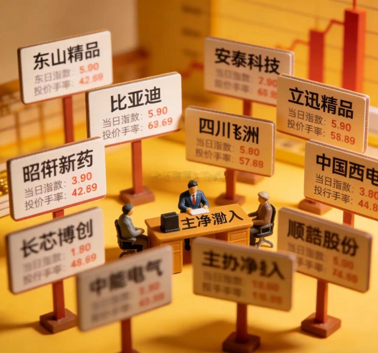 今天主力资金流入较多的10支股票,具体信息分析如下:1. 东山精密:主力净流入11.14亿元,当日涨幅7.75%,股价为84.86元,换手率10.50%。公司是全球最大的PCB制造商之一,在AI算力、PCB、光模块等领域有较强的竞争力,其业务增长预期较高,受到主力资金的青睐。2. 安泰科技:主力净流入8.13亿元,当日涨幅9.98%,股价为20.32元,换手率3.77%。2025年三季报显示,公司每股净资产5.39元,每股收益0.2702元,公司在可控核聚变、钨钼材料、稀土等领域有重要布局,随着相关产业的发展,公司前景被看好。3. 比亚迪:主力净流入7.77亿元,当日涨幅0.80%,股价为97.34元。2025年三季报显示,公司营收和净利润都有较大幅度的增长,基本每股收益为2.56元,公司在新能源汽车和电池领域的龙头地位稳固,业务发展前景广阔。4. 立讯精密:主力净流入6.08亿元,当日涨幅3.66%,股价为60.27元。公司是消费电子领域的龙头企业,近年来积极拓展汽车电子、储能等新业务,尤其是在人形机器人领域有较大的发展潜力,特斯拉审厂落地有望为公司带来新的增长机遇。5. 四川九洲:主力净流入5.17亿元,当日涨幅9.98%,股价为17.85元,换手率12.72%。公司在低空经济、军工信息化等领域有一定的优势,近期的业务发展和政策支持使得公司受到资金关注。6. 中国西电:主力净流入4.71亿元,当日涨幅10.06%,股价为9.08元。2025年三季报显示,公司每股净资产4.41元,每股收益0.1831元,公司是特高压领域的重要企业,随着电网建设的推进,公司业务有望持续增长。7. 昭衍新药:主力净流入4.19亿元,当日涨幅9.99%,股价为34.35元。公司是国内药物临床前研究服务的龙头企业,随着医药研发投入的增加,公司的业务量不断增长,业绩表现良好。8. 长芯博创:主力净流入4.12亿元,当日涨幅11.58%,股价为148.01元。公司是综合光电互联的一站式解决方案提供商,横跨电信、数通、消费和工业互联三大领域,其1.6TAEC产品和硅光模块等具有较强的竞争力,绑定谷歌等大客户,发展前景广阔。9. 中能电气:主力净流入3.60亿元,当日涨幅20.04%,股价为10.78元。公司在储能、充电桩、智能电网等领域有业务布局,随着新能源产业的快速发展,公司的业务需求不断增加,股价也受到资金的推动。10. 顺灏股份:主力净流入3.03亿元,当日涨幅10.00%,股价为15.95元。公司在商业航天、太空算力、环保纸等领域有业务涉足,近期的业务发展和市场预期使得公司受到主力资金的关注。以上内容均由公开网络信息整理而得,不构成任何投资建议。