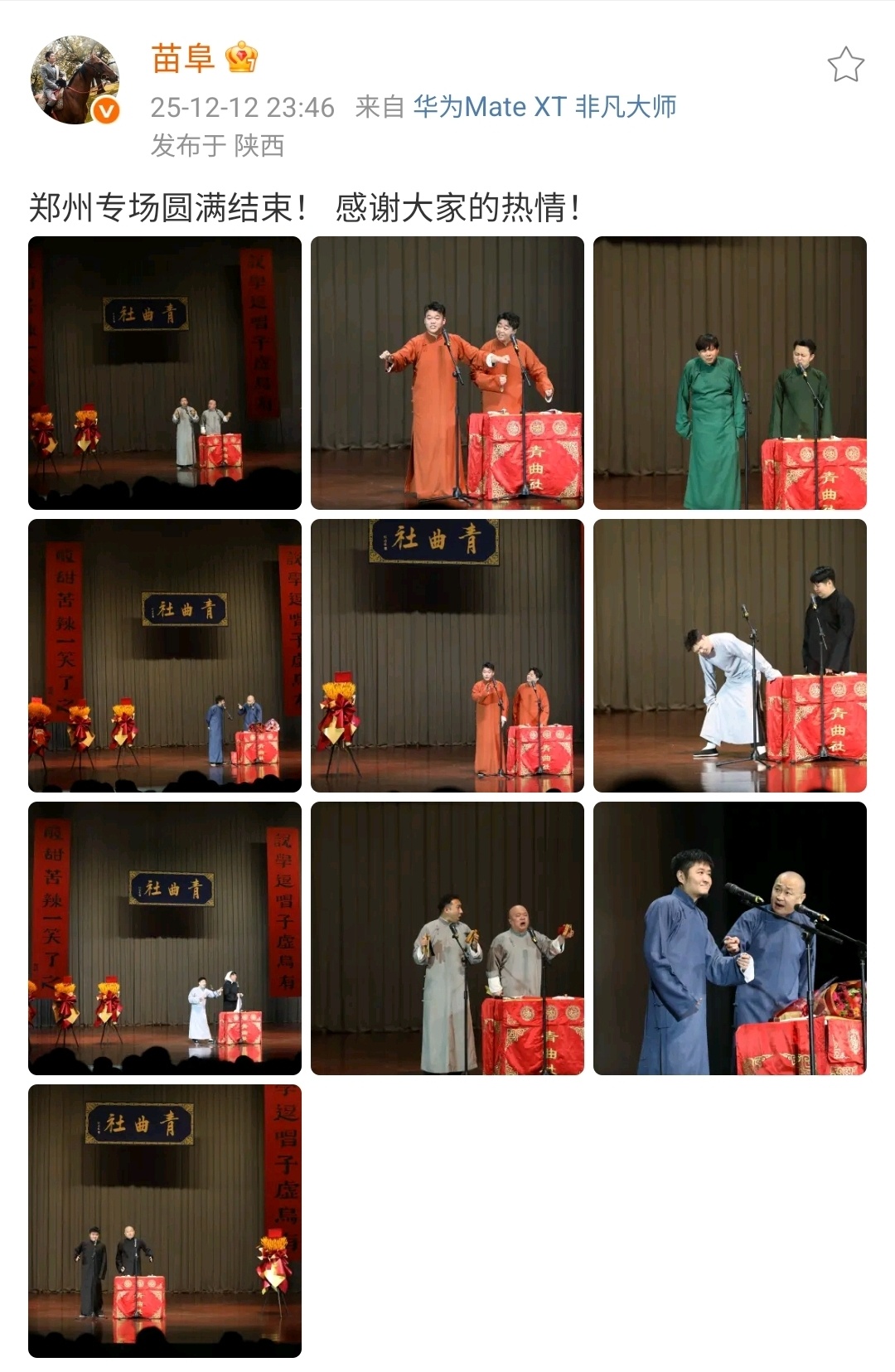 青曲社的苗阜比起德云社的郭德纲来,始终还差点意思。相声水平怎么样放一边,就说这个拍照的方式,就有点露怯了。人家德云社郭德纲演出的时候,表演完在网上放的都是观众席的照片。满坑满谷,人山人海,座无虚席。说明人家人气和和卖票的能力确实强。苗阜同样是四处演出,拍的照片却是舞台上的。虽然说也很好看,但是,很多网友难免心里有疑问,台下到底有有多少观众啊?