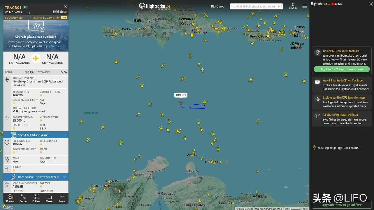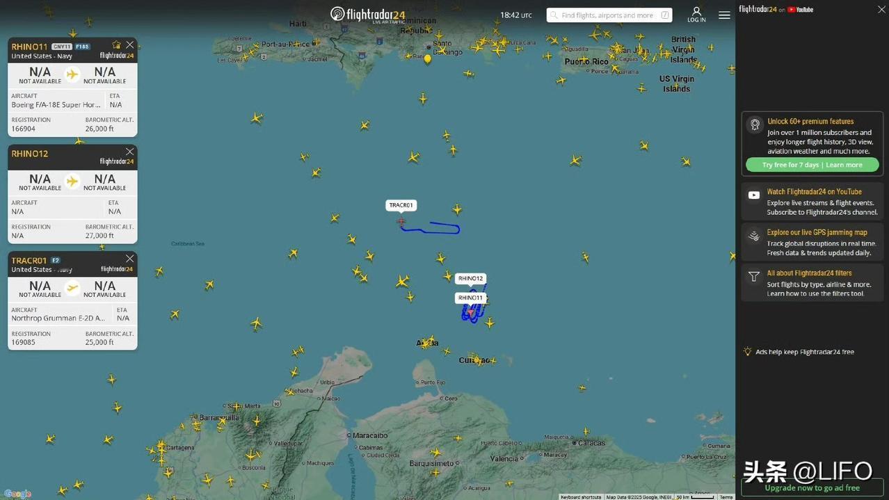 2025 年 12 月 13 日,加勒比海域。美军杰拉尔德·R·福特号核动力航母(CVN-78)RHINO11,AE20CF 美国海军 F/A-18E 超级大黄蜂RHINO12,AE5B1E 美国海军 F/A-18E 超级大黄蜂TRACR01,AE5D5B 美国海军 E-2D 鹰眼预警机数据来自 F24