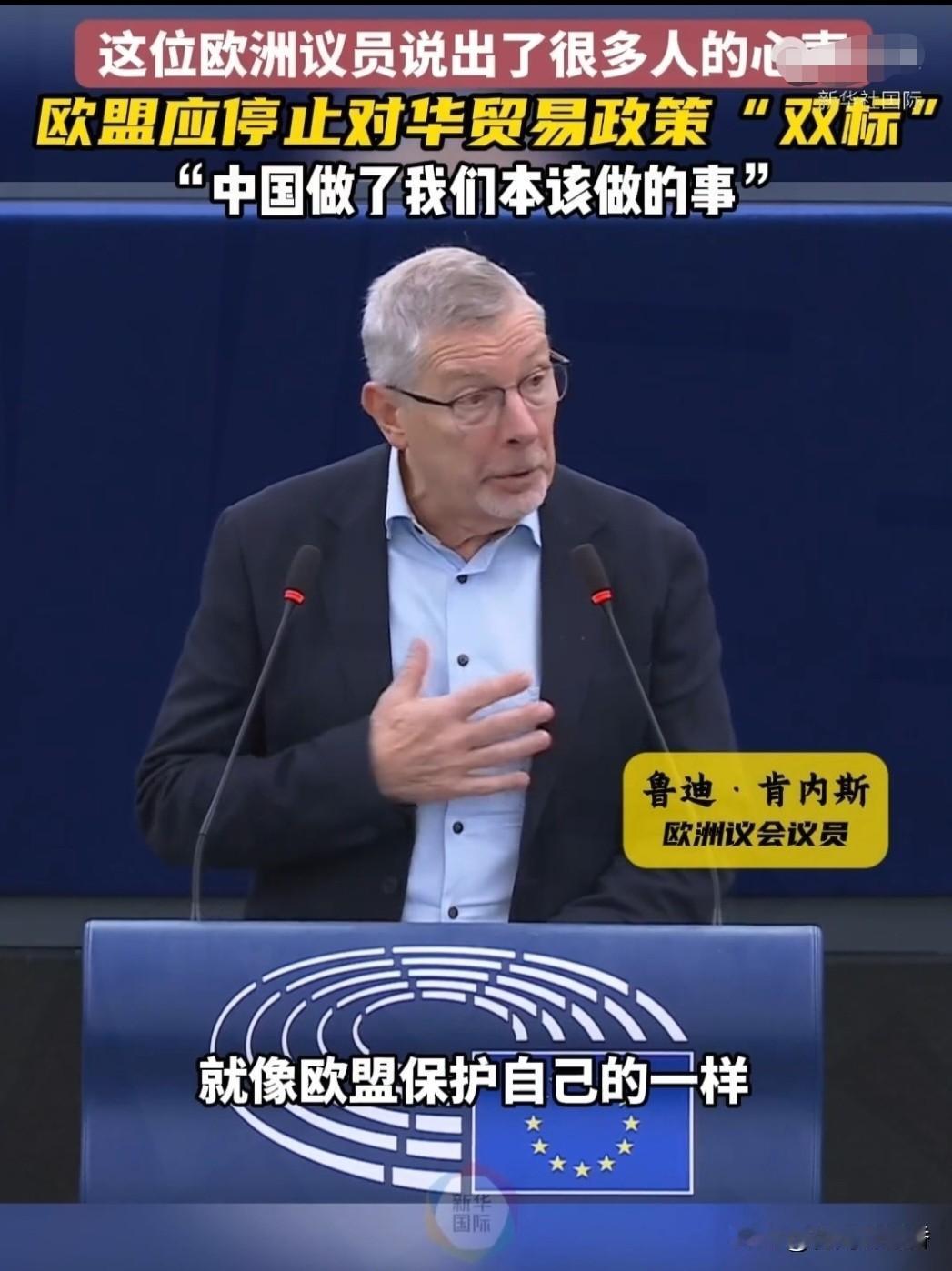 欧洲议员 一句话让议会沉默! 中国新能源遭双标,公平贸易何在 比利时议员鲁迪·肯内斯在欧洲议会的灵魂质问“难道中国无权像我们一样捍卫自身利益”,让全场陷入沉寂,也戳破了欧盟对华贸易的双标面具。 欧盟常年将环保减排挂嘴边,中国真金白银投入新能源,建成全球最完整产业链,新能源汽车产销量连续10年全球第一,向世界供应80%光伏组件,切实助力全球绿色转型 。可欧盟转头就以“产能过剩”为由,对中国电动车加征最高37.6%关税,搞贸易保护主义。国际社会已有声音批评欧盟政策“过于依赖美国”,贸易对抗对欧洲弊大于利。 在我看来,欧盟的做法本质是霸权思维,自己能发展却限制他国进步,违背多边贸易规则。中国凭实力抢占产业高地,不该被不公平对待,合作共赢才是大势所趋。 大家觉得欧盟对华加税的行为合理吗?中国新能源该如何应对贸易壁垒?欢迎在评论区分享你的看法!中国欧盟贸易欧洲双标 欧盟争议言论