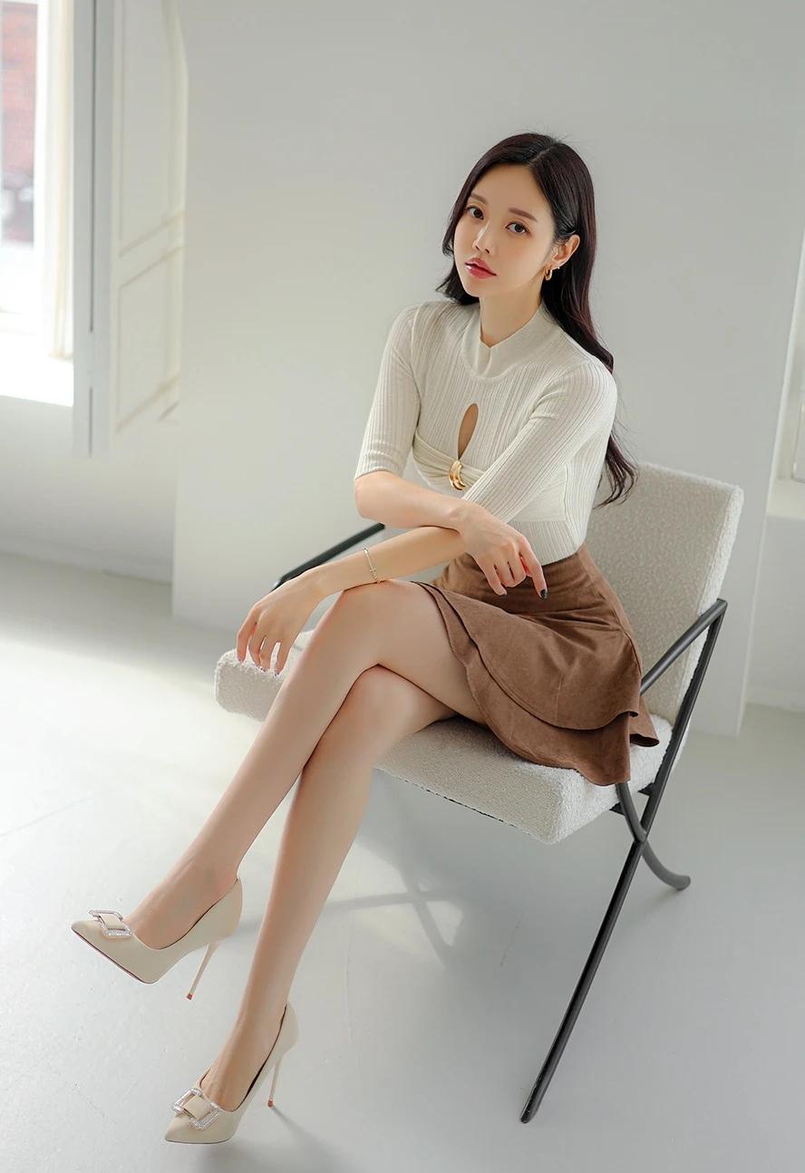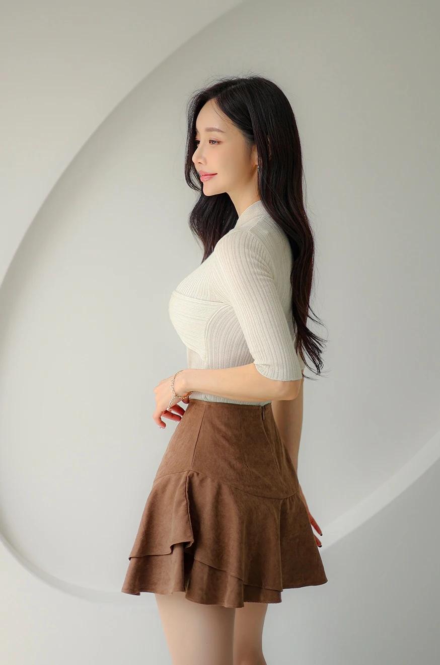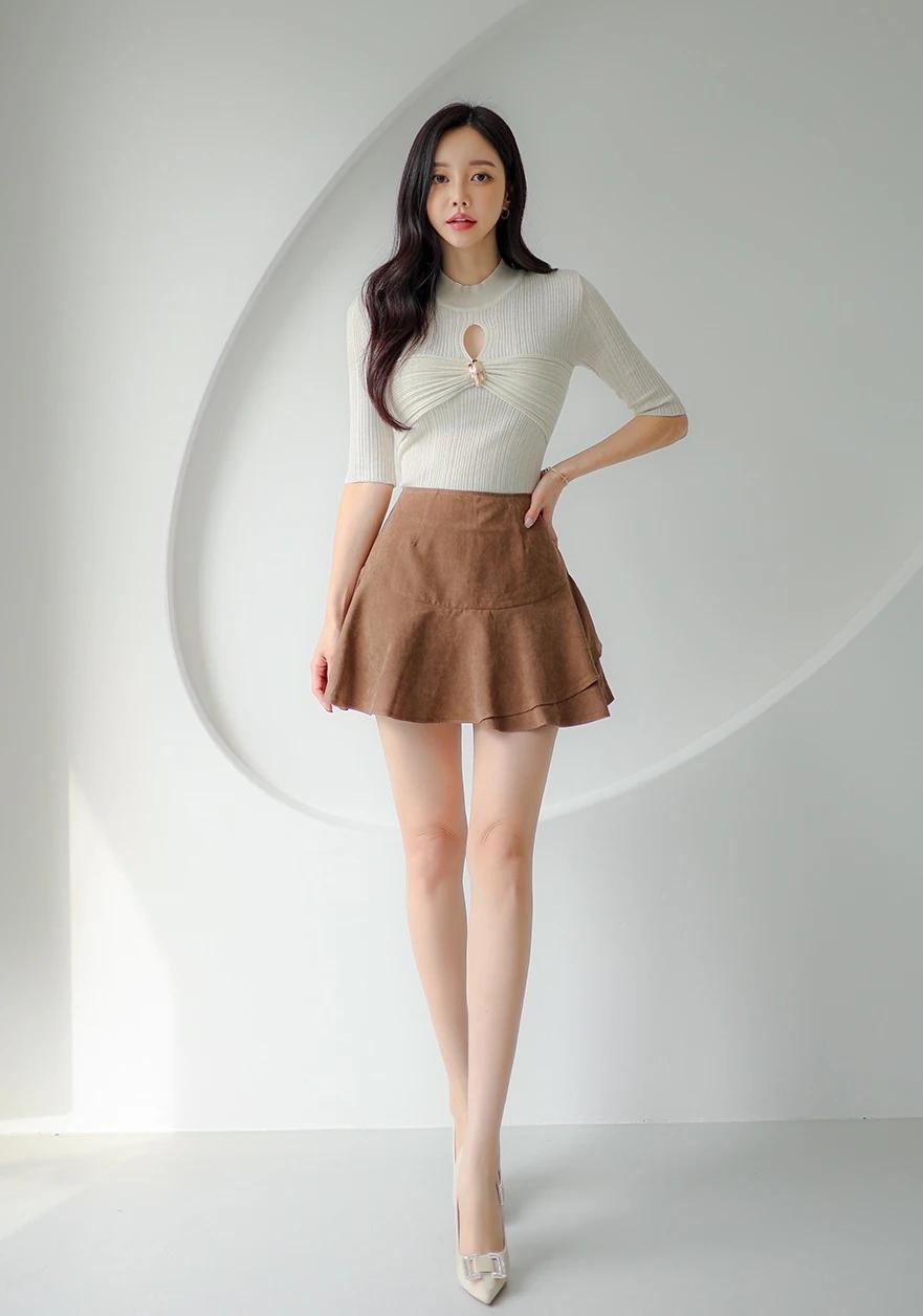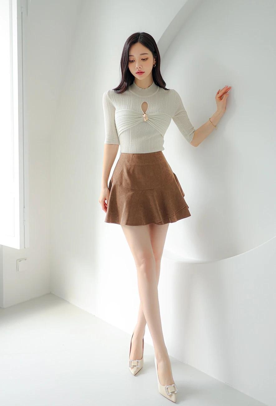 孙允珠-气质穿搭,米色高领毛衣搭配棕色短裙,简约时尚。生活随手拍一拍 拼接潮流穿搭 棕色短裙穿搭