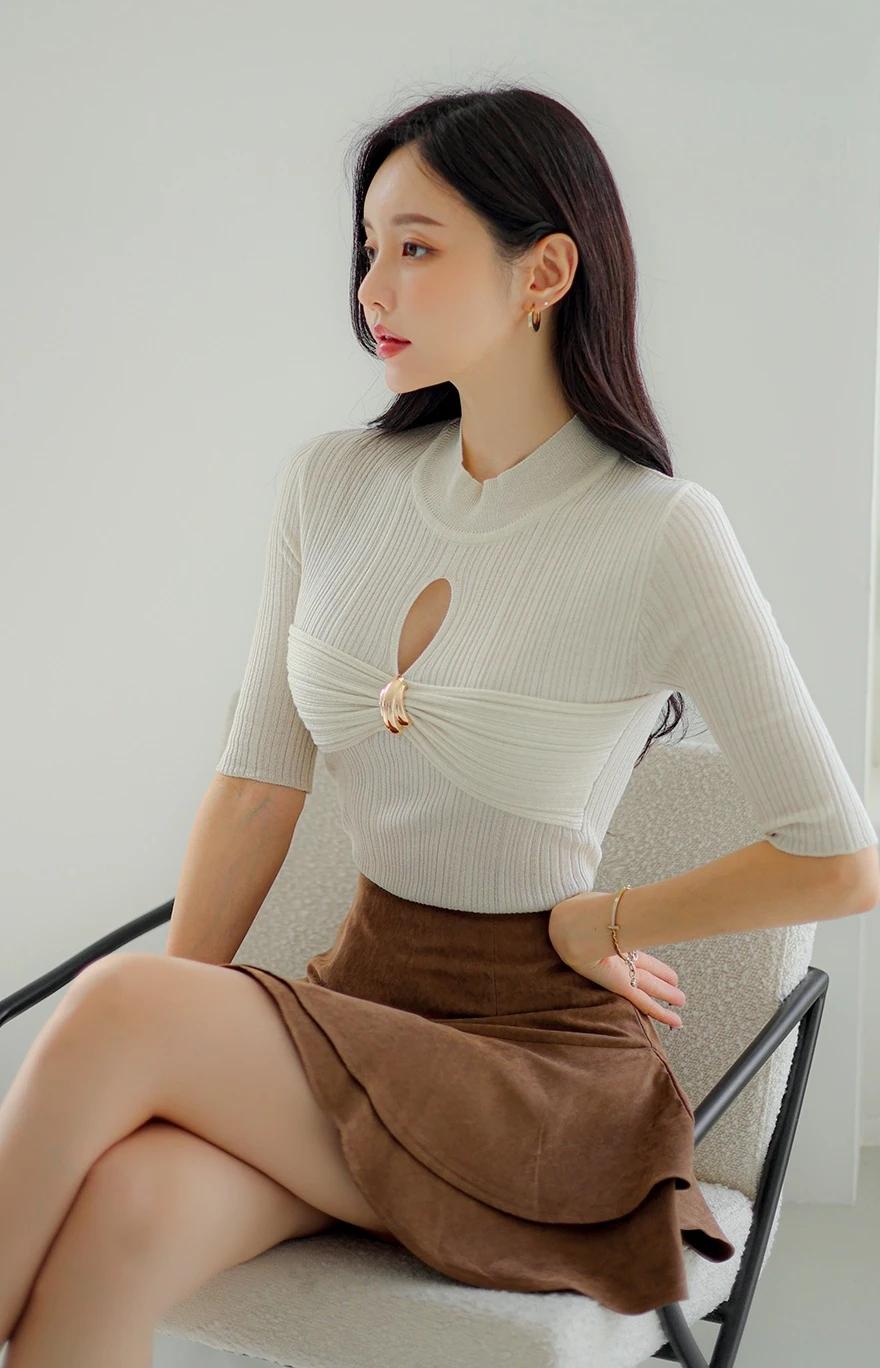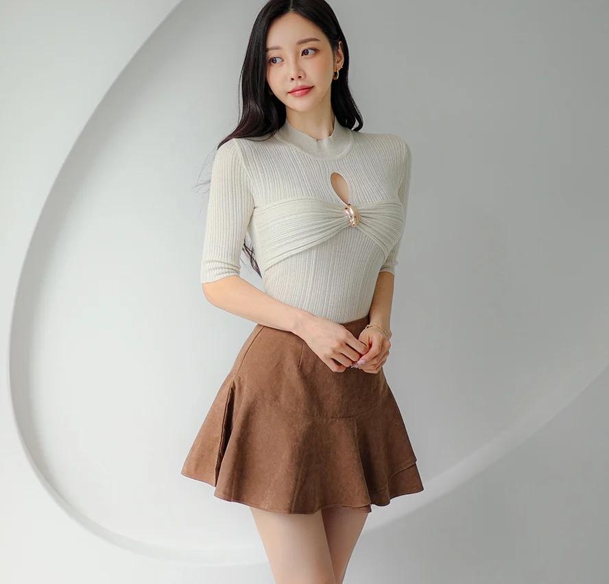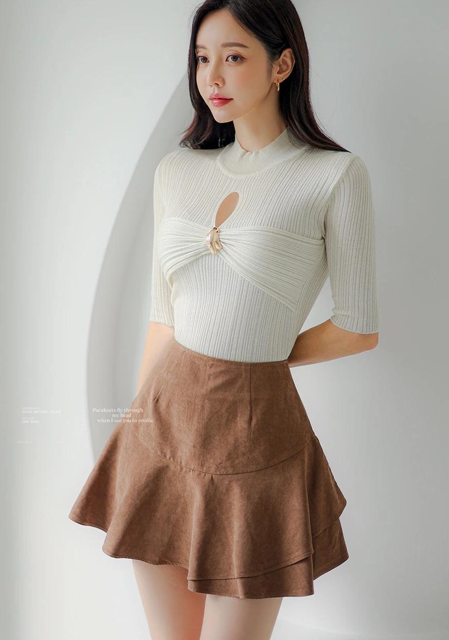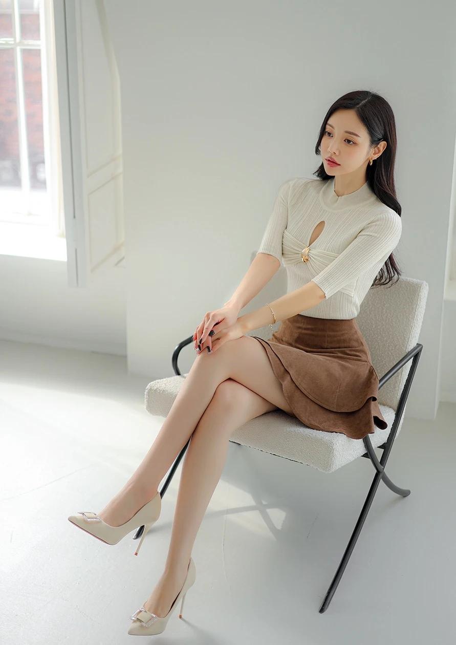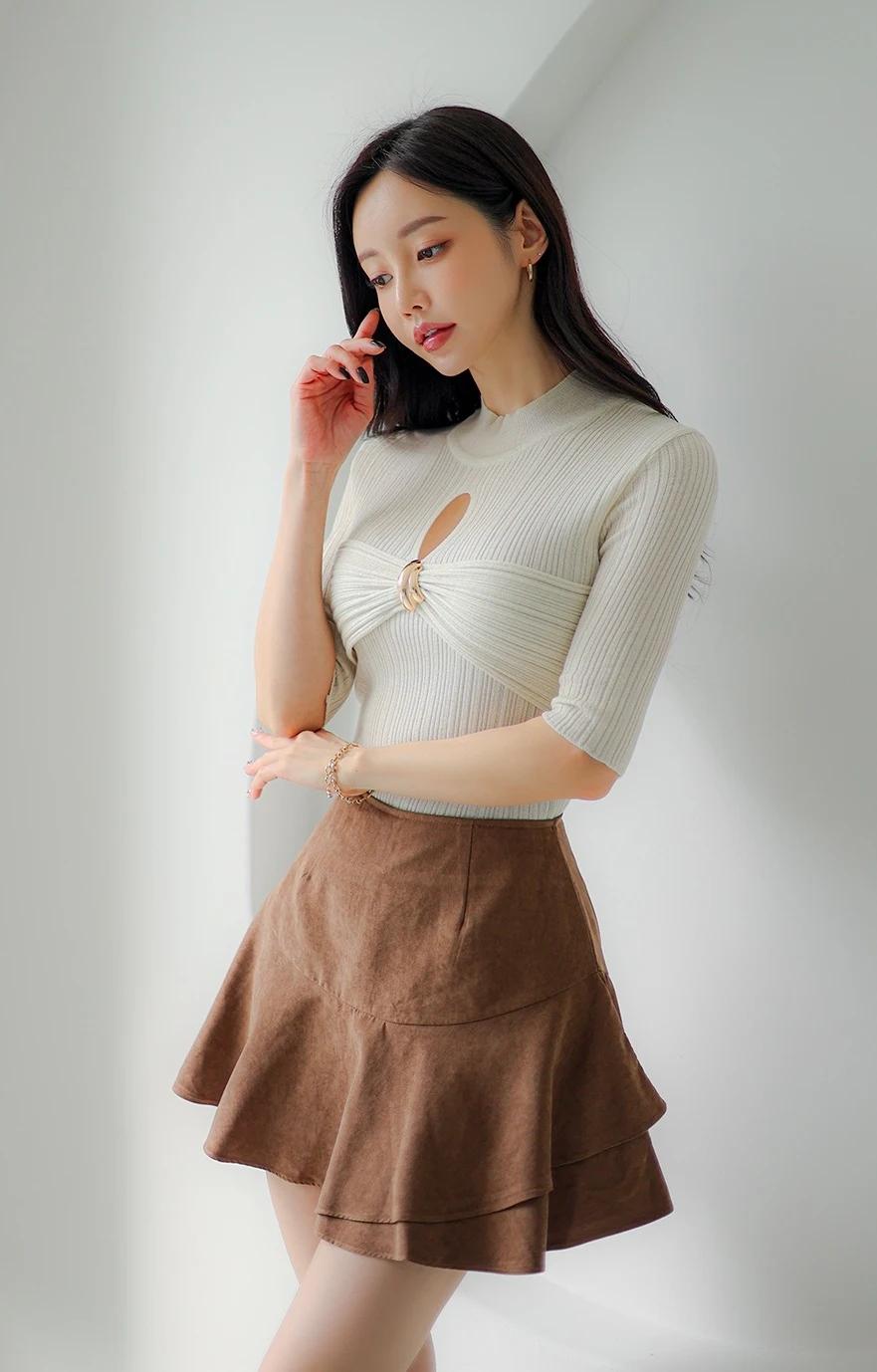 孙允珠-气质穿搭,米色高领毛衣搭配棕色短裙,简约时尚。生活随手拍一拍 拼接潮流穿搭 棕色短裙穿搭