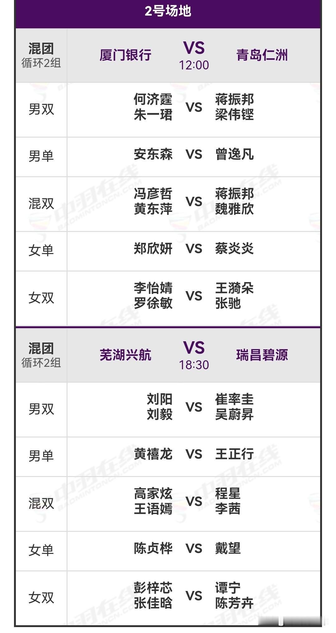 12月13日中国羽毛球俱乐部超级联赛赛程安排 今日,混团第二组循环赛继续上演,两块场地将同时进行比赛。白天场于12:00准时开启,对阵双方分别是辽宁极兔与浙江竞体、厦门银行与青岛仁洲;晚场则在18:30鸣锣开战,参赛队伍为深圳羽众对阵江苏羽超、芜湖兴航对阵瑞昌碧源。 今日赛场上,陆光祖、翁泓阳、黄雅琼、王正行、凤凰组合等国羽新老队员将悉数登场,徐承宰、安东森也会亮相赛场。喜爱羽毛球的球友们切勿错过这场精彩赛事,详细对阵名单如下: 羽球赛程 羽毛球赛事 羽毛球 羽毛球爱好者 羽毛球比赛 黄雅琼 凤凰组合