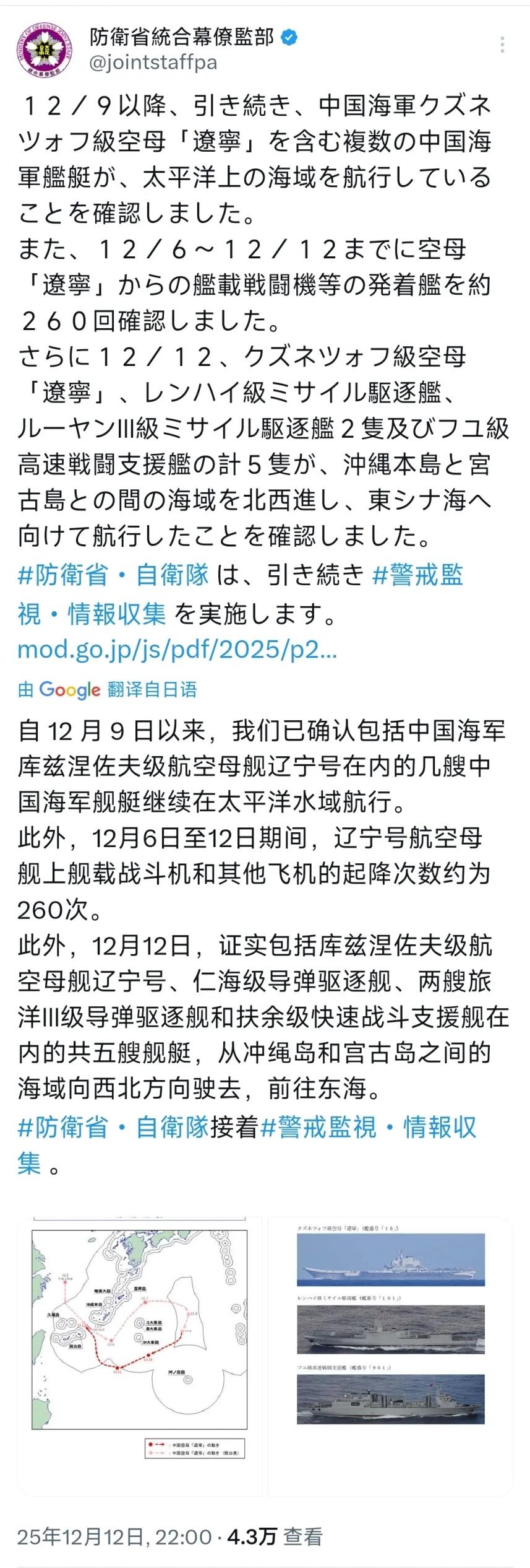 松口气 日防卫省发文写道:“自12月9日以来,包括中国海军辽宁号在内的几艘中国海军舰艇继续在太平洋水域航行。12月6日至12日期间,辽宁号航空母舰上舰载战斗机和其他飞机的起降次数约为260次。12月12日,辽宁号等五艘舰艇,从冲绳岛和宫古岛之间的海域向西北方向驶去,前往东海。” 还狡辩日本没收到中方通报?连辽宁号起降260次战机都数得一清二楚。现在辽宁号编队在突袭北上后绕一圈又折返宫古海峡进入东海后,日方悬着的心终于轻松下来了。 一直以来,日本就热衷对中国海军舰艇正常活动瞎监视、瞎炒作。这次对辽宁号编队紧盯着不放,妥妥一个做贼心虚的“偷窥狂”! 可中国海军行动合法合规,辽宁号编队这次行动,既是正常训练巡航,也是实力展示,向世界宣告中国能维护主权和海洋权益。日本见辽宁号编队进东海“松口气”,就是自我安慰。中国海军会继续发展行动,日本老这么警惕恶意,以后也别想安心,说不定马上来更厉害的“大家伙”!