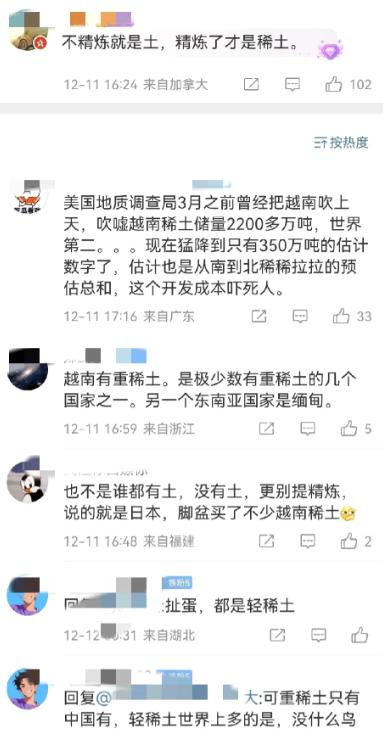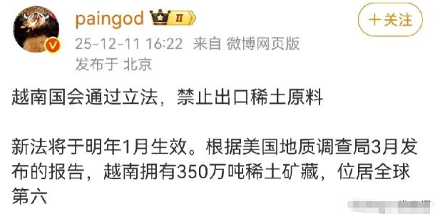 稀土不是有矿就行,越南还得迈过技术坎 最近越南那边出了个新政策,国会刚通过修订后的地质与矿产法,明确把稀土当成战略资源管起来,以后稀土原矿都不许出口了,这政策明年年初就生效。 消息一出来,不少人觉得越南是想学着咱们搞稀土产业,可这事儿真没那么简单。 很多国家都犯了个想当然的错,觉得有稀土矿就能站上产业链顶端,之前就有说法把越南的稀土储量吹得特别高,后来权威机构又给出了完全不同的判断。 其实这压根不是重点,放眼全球,轻稀土本来就不缺,真正制约产业的从来不是矿石,而是把矿石变成可用材料的提炼技术。 稀土这东西看着是矿,里面却裹着各种杂质,有的还带着放射性元素,要把里面的有用成分分开提纯,比拆精密钟表还难。 咱们国家花了几十年才摸索出成熟工艺,现在能把稀土产品纯度做得特别高,还能控制住污染,这套技术连国外都很难学去,就像有人拿到一堆零件,没有图纸和手艺,根本拼不出能运转的机器。 真正金贵的是重稀土,全世界找不出几个地方有,咱们国家江西、云南一带有,缅甸北部也有产出。 现在咱们自己的重稀土矿基本不怎么动,主要是进口缅甸的矿回来提炼,加工成高性能磁铁再出口,这才是产业链最赚钱的环节。 越南想走这条路,先得看看自己的家底,提炼稀土不光要技术,还得有稳定的电力和环保配套,这些都是耗电耗力的大工程。 可越南常出现电力短缺,工厂时不时就得停工,连基本生产都保障不了,更别说攻克高难度技术了。 他们现在连像样的稀土精炼产能都没有,光靠禁止原矿出口,顶多是守住了原材料,离真正的产业升级还差着十万八千里。 以上都是个人观点,对此您有什么不同的看法,可以在评论区留言讨论!!!