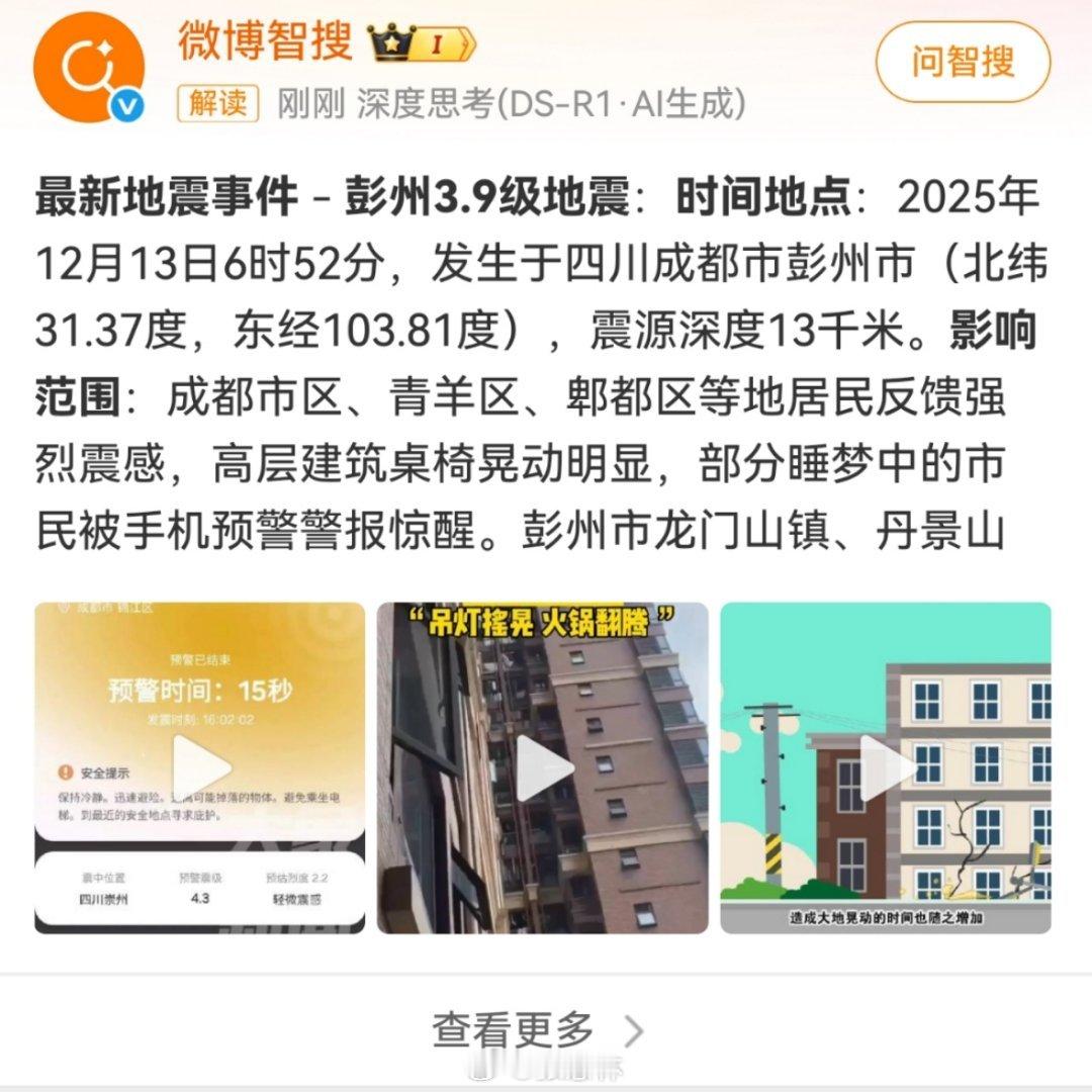 成都地震12月13日,成都彭州3.9级地震。据当地朋友说有明显震感,大家注意安全。