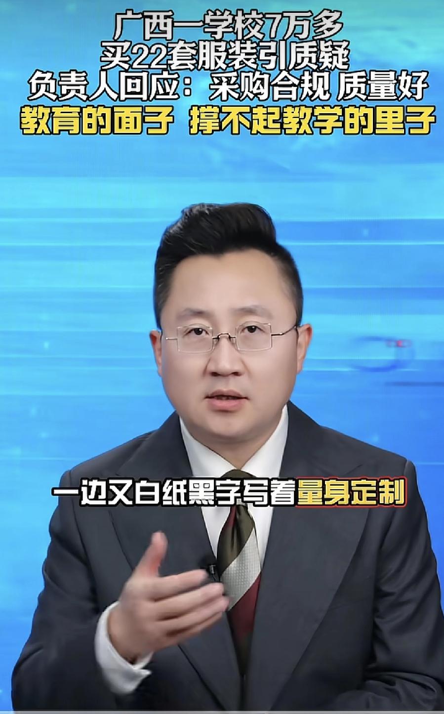 广西一学校,7万7买了22套老师工装,算下来一套3500!学校说是“量身定制”,但全校280多个老师,这22套是给谁量的?“高级面料”上课穿,是不是有点过于隆重了?经费到底该花在衣服上,还是花在学生和教学上? 7万多块就买了22套衣服,老师都懵了:我们上课比赛,需要3500一套的战袍吗? 至于为何是22套?难道是“精英定制版”,那么其余260多位老师,你们该加油了!