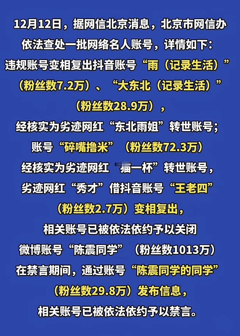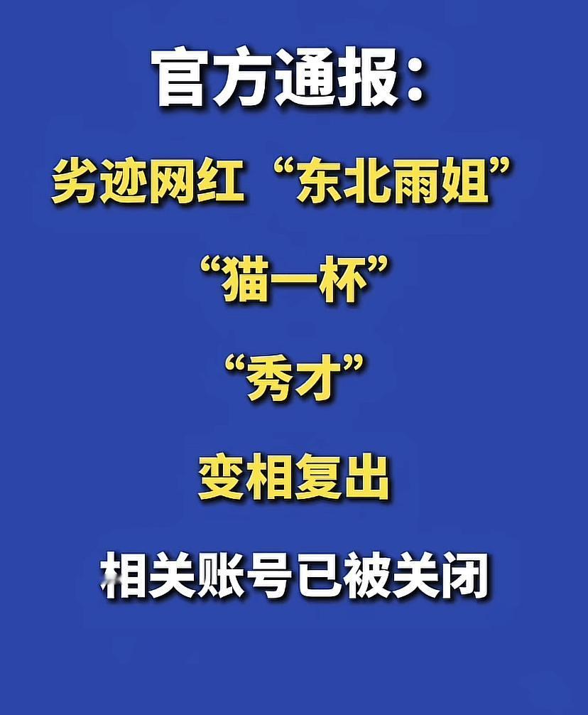官方消息!劣迹网红“东北雨姐”、“猫一杯”、“秀才”变相复出相关账号已经被关闭! 还是互联网这碗饭挣钱呀,东北雨姐竟然连续创作两个新的账号,而且粉丝数量都比较多,这两个账号也被关停了。 猫一杯创造的新账号,粉丝数量更是达到了70多万,同样的也被关停了。还有叫做秀才的,也是借用其他账号也被关停了。 值得注意的是,这里面还提到了陈震,陈震在禁言期间使用了其他账号发言,结果也被禁言了。 这一下像东北一姐肯定是再也不能复出了。对于劣迹网红,大家觉得这一招好不好?彻底封死他们,可能付出的动作。 各位是怎么看的?欢迎评论区留言。